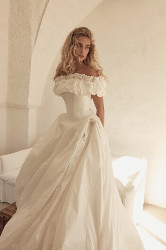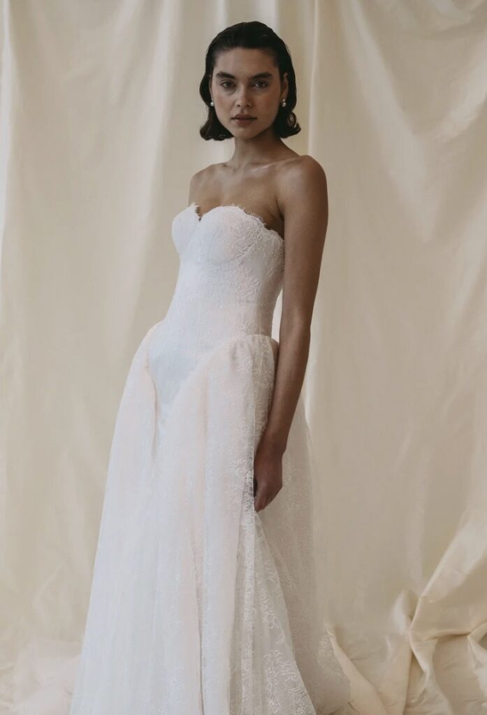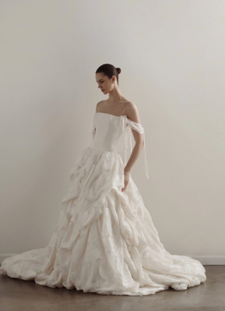 Designer Brianna Furfaro’s experience in dance informs the kinetic cut of SEPT bridal gowns, with bias seams and invisible boning – designs that move well. The 2027 collection shown at New York Bridal Week includes voluminous strapless ballgowns and feathery lace dresses, with the option to accessorise with a lace or silk shrug.