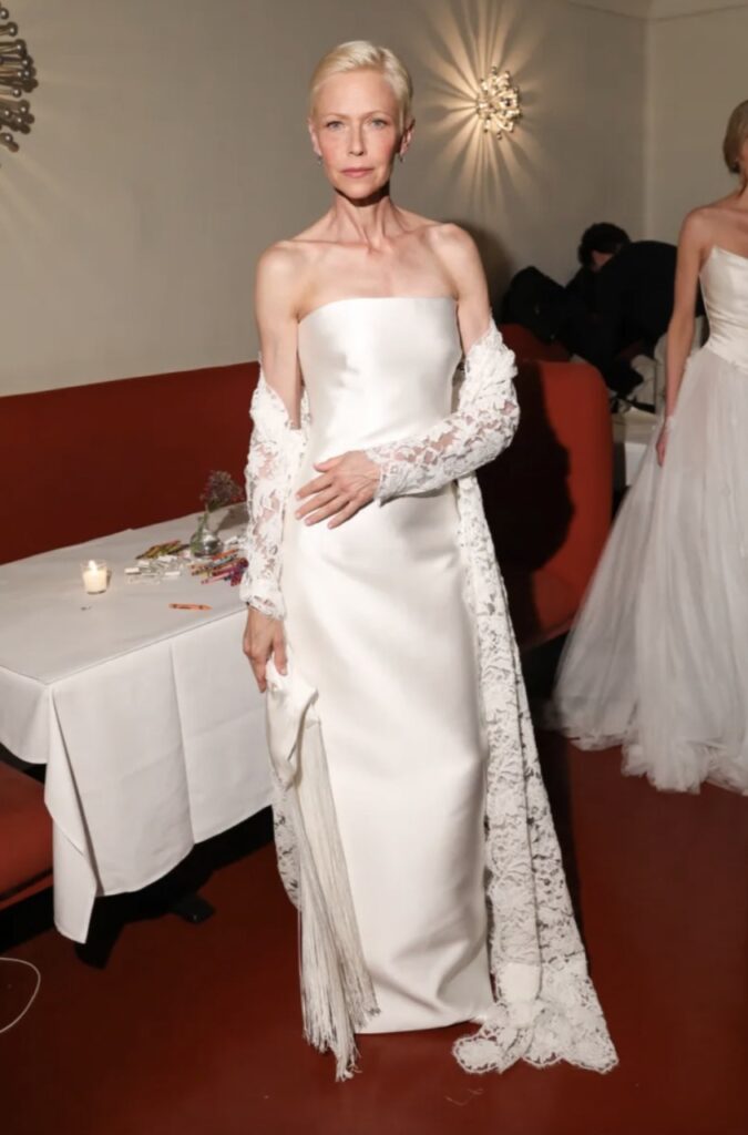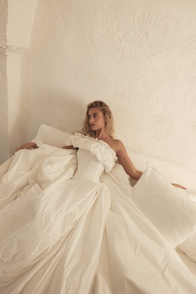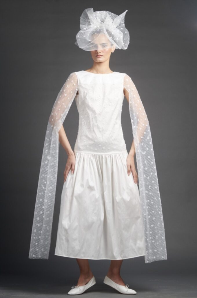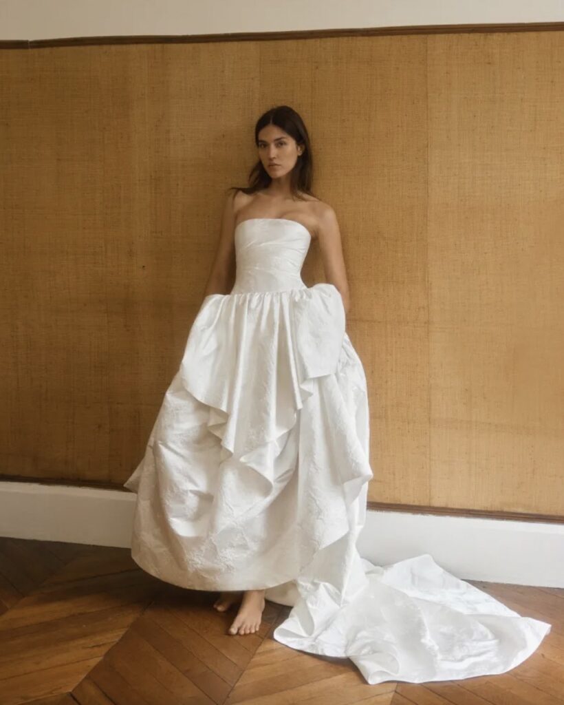 The New York-based label made its bridal debut with a 2026 collection uninterested in traditional bridal codes. Designer Leslie Holden’s background in menswear tailoring was evident in the structured blazers and suiting options, including a wearable double-breasted silk faille coat-dress that could easily transition to post-wedding life.