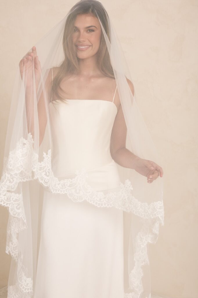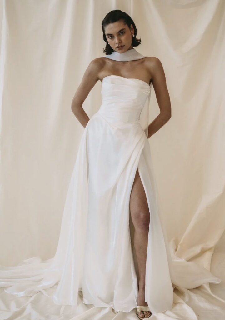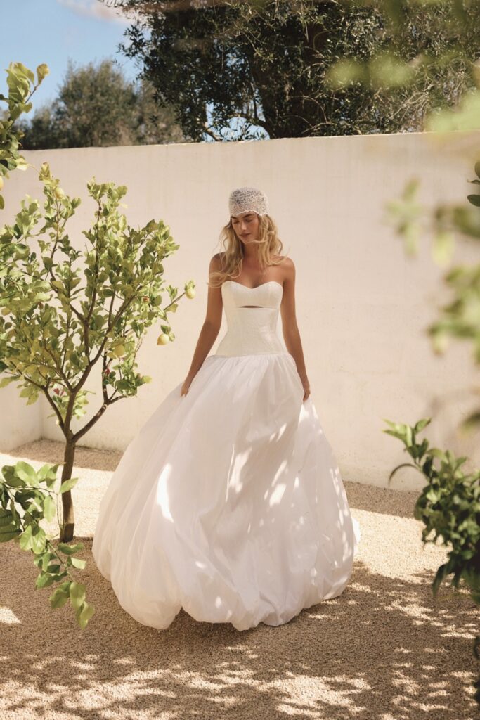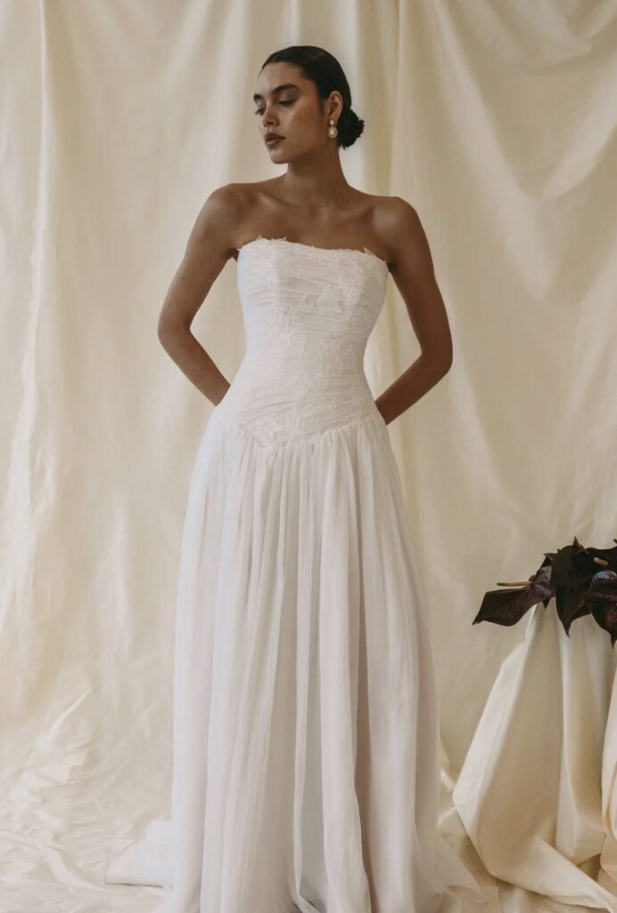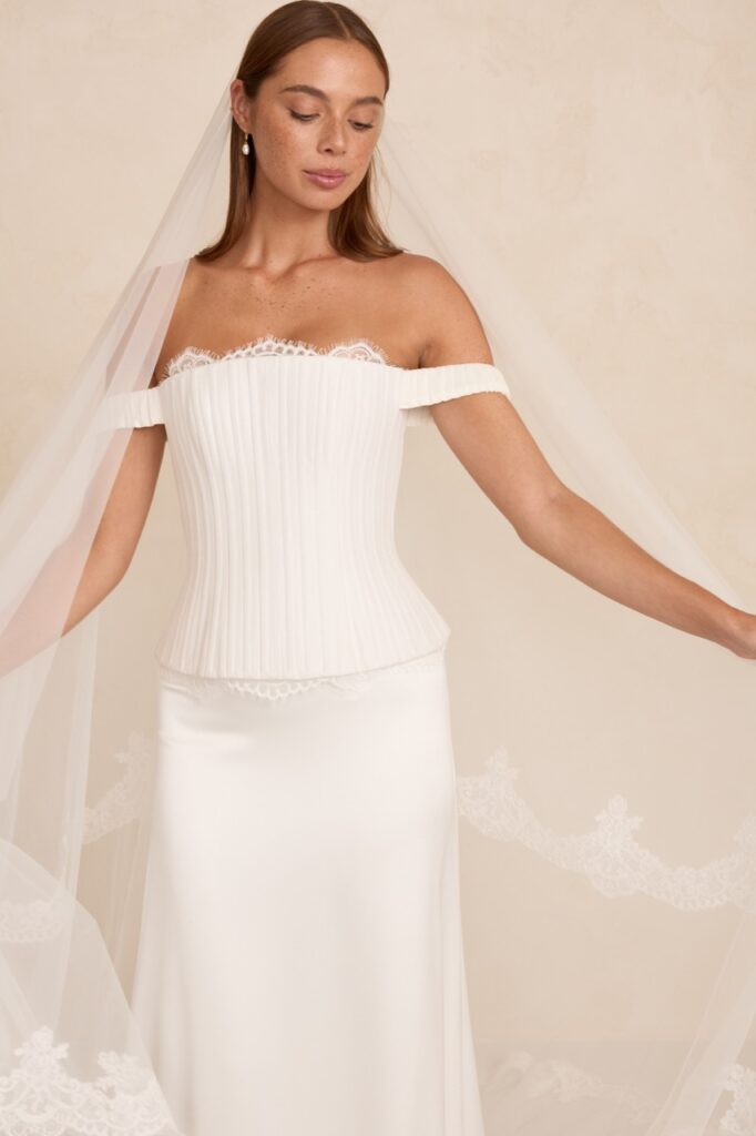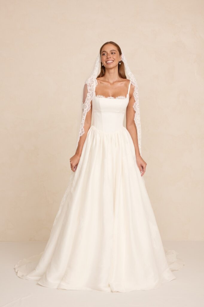 The Australian-founded brand, known for its easy 90s minimalism and effortless designs, showed a collection at New York Bridal Week 2026 that emphasised the imperative of good construction: neat strapless columns in ivory silk, A-line gowns, barely-there straps and light-touch tulle veils with lace borders.