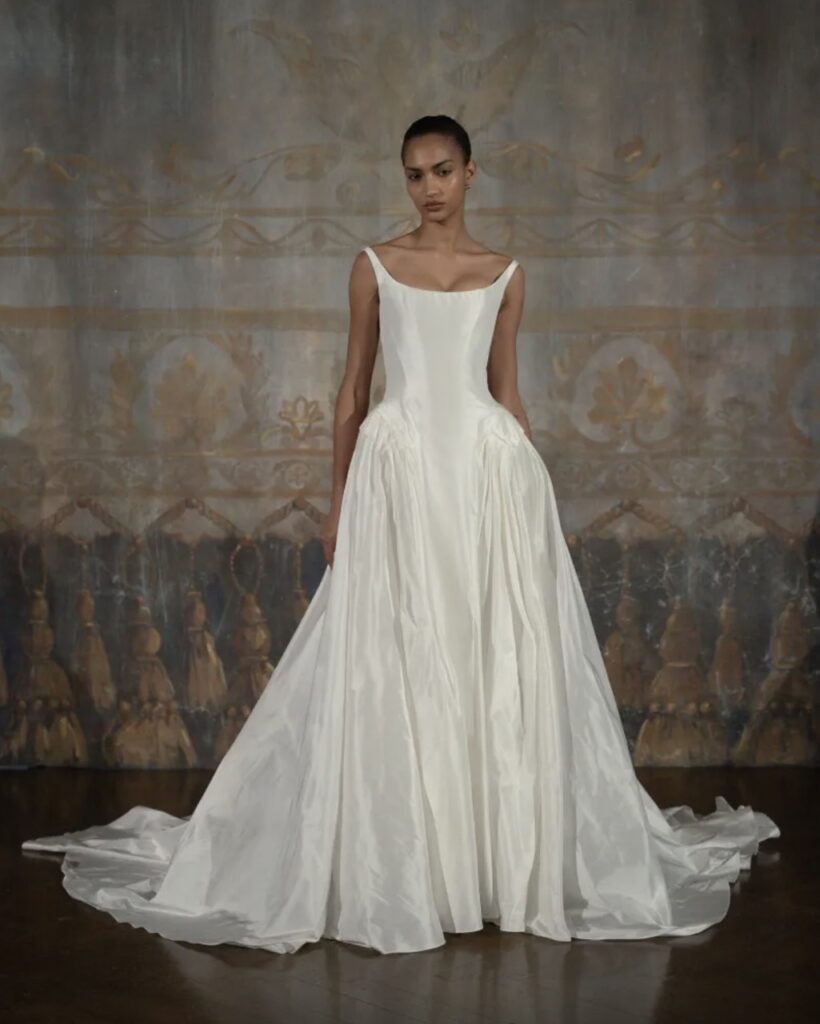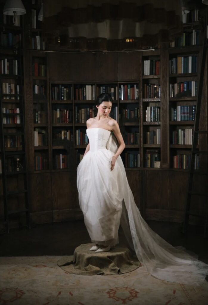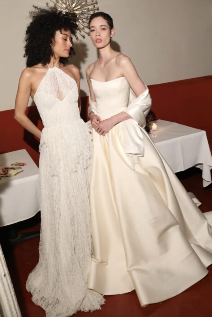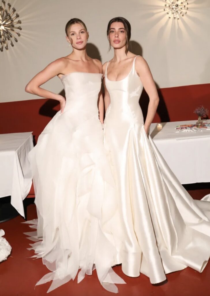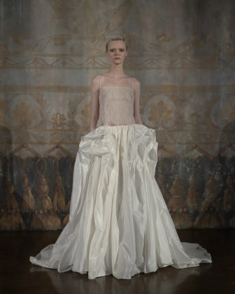 The verdict from New York Bridal Week 2026 is in, and it is divided. On one end, 90s minimalism, with its slip cuts, ivory crepe, Herb Ritts references, reigns supreme as the default house style for a new generation of international ateliers. On the other, an equal and opposite reaction: vintage rules, with more-is-more whimsical accessories, 18th-century silhouettes and panniers making a comeback. The bride, it seems, can have it both ways.