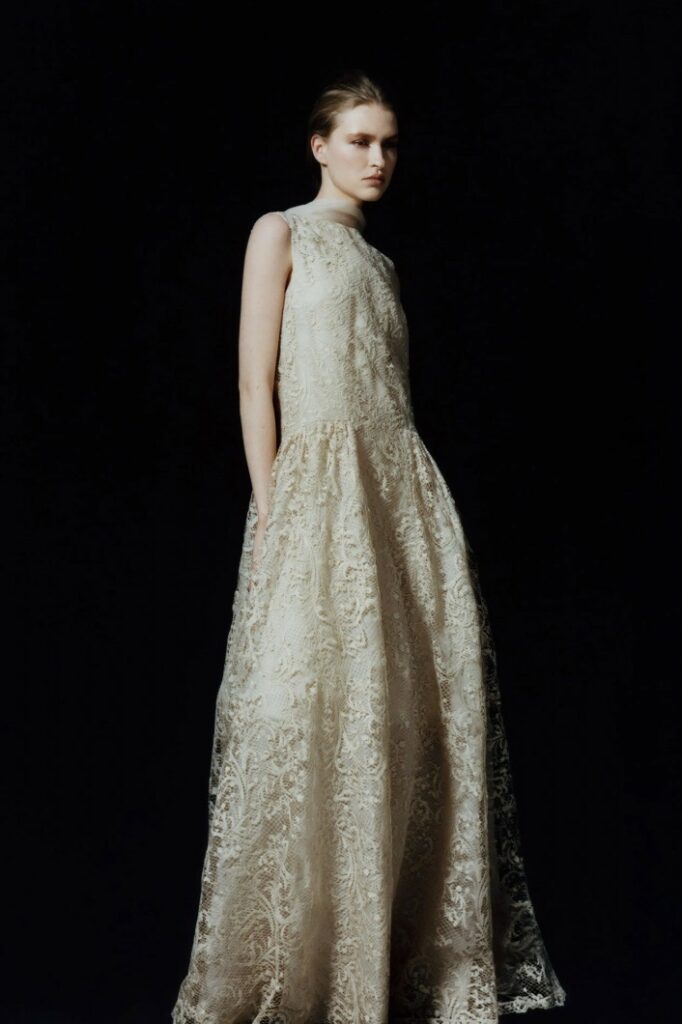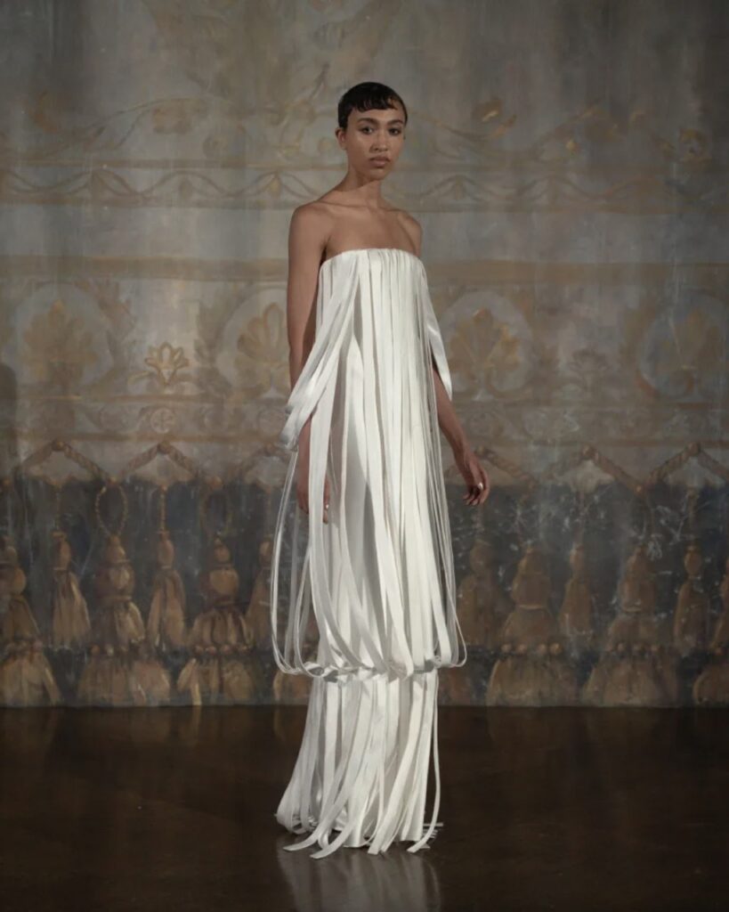 The West Village designer who built her reputation on bias-cut silk and a near-monastic commitment to restraint showed a 2026 collection, ‘Dream, Baby, Dream’, that moves between historical eras: 1920s-style head caps and beading; barely-there feather lace tops of the 2020s with a voluminous ballgown skirt; and, of particular note, a strapless two-tiered gown, cut and feathered to evoke paper, rather than fabric.