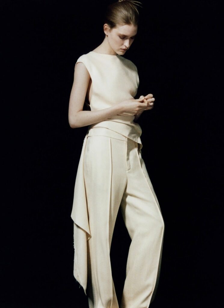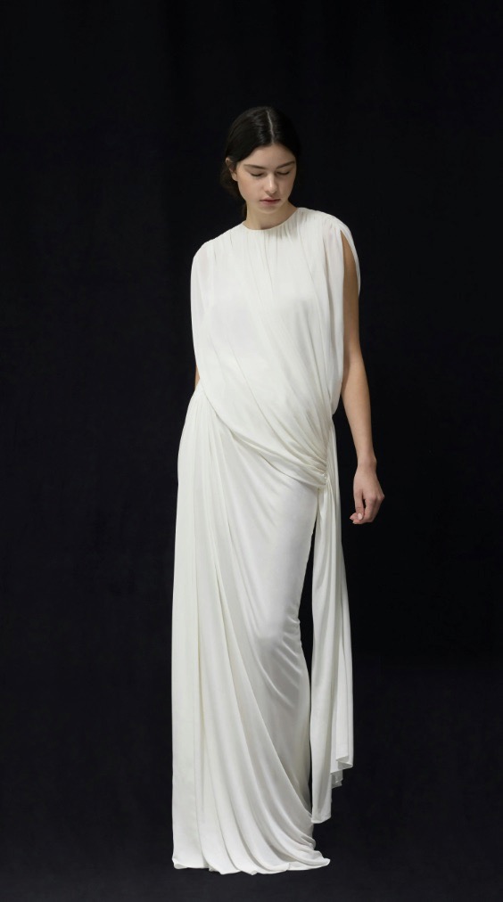 Laura Carmel continues a language of restrained modernism, volume without ornament, with her latest collection: sculptural silk organza sheaths and soft square necklines paired with asymmetric cuts and basque waists. The designs either sing solo or simple styling, with the slight addition of a 90s scarf tucked behind the neck for added cool.