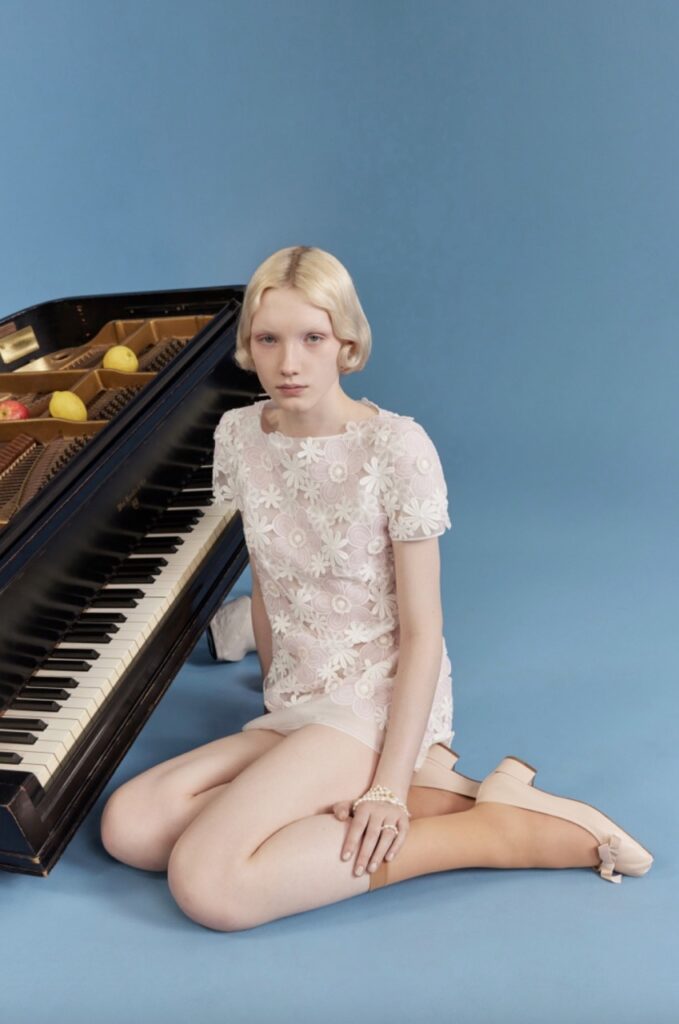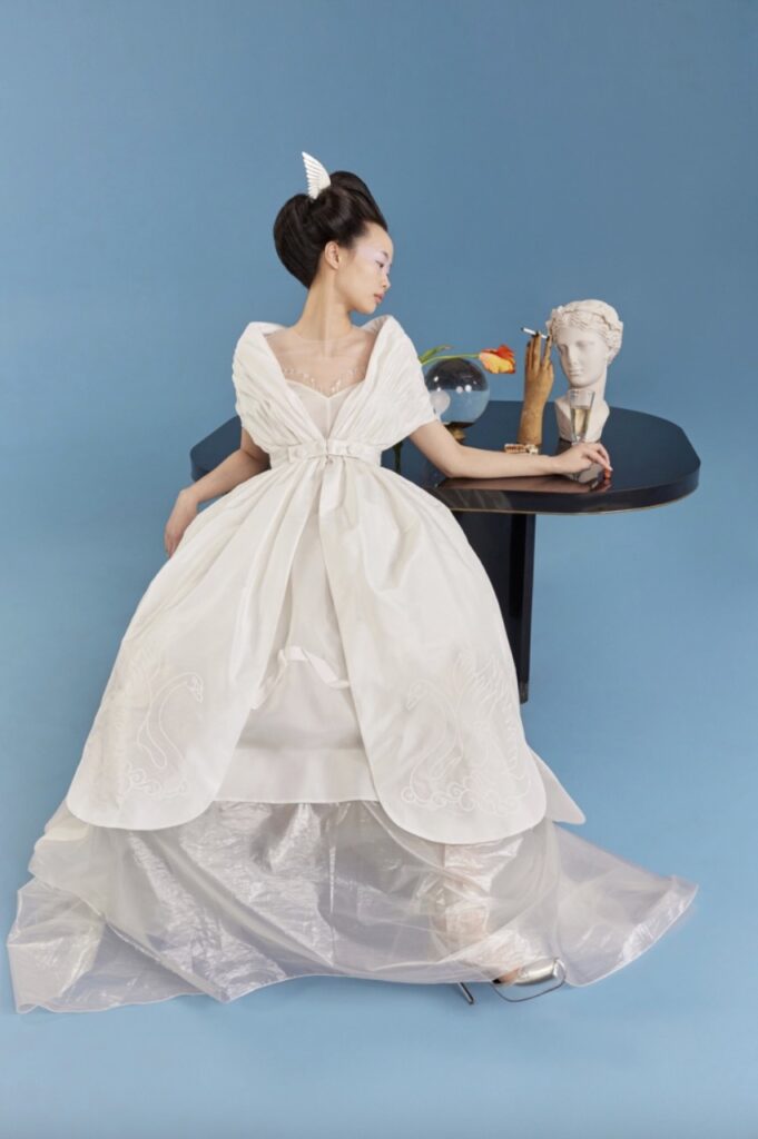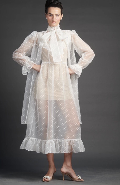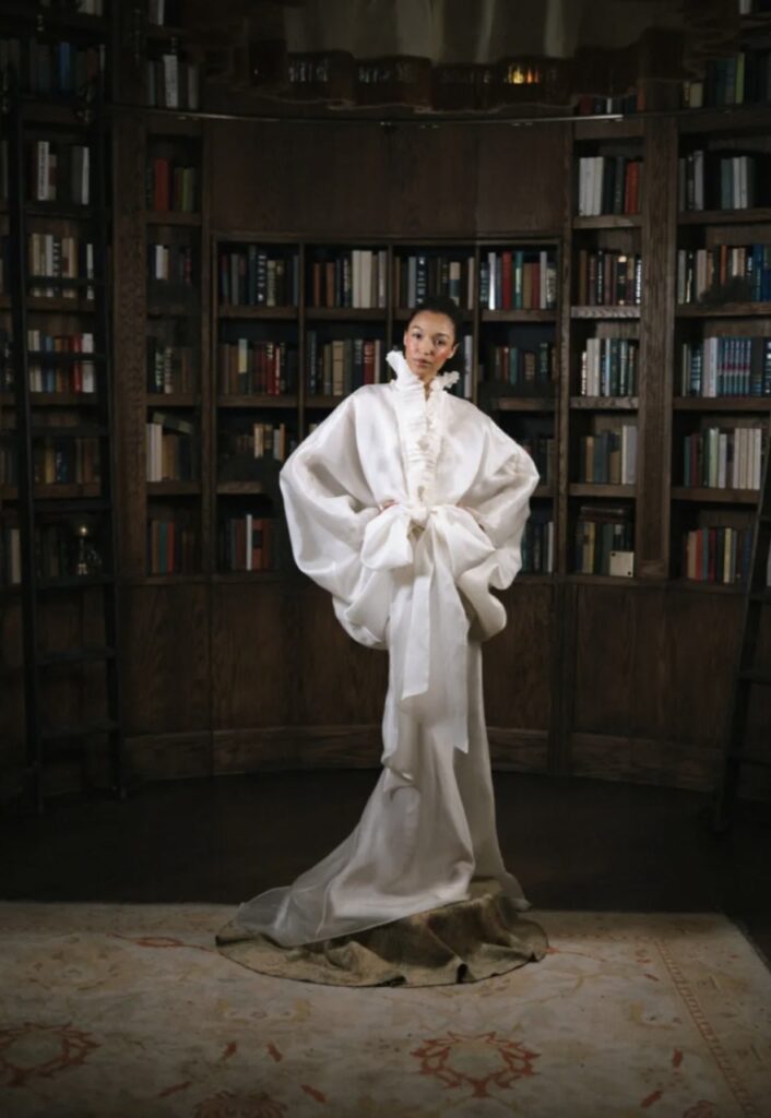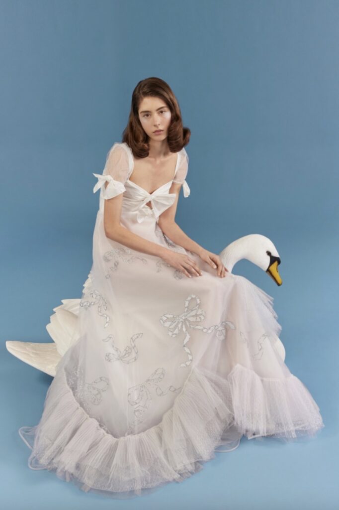 The New York-based label brings narrative to their 2027 bridal collection, as told through irreverent cinematic staging, whimsical Edwardian tea gowns and 60s mini dresses and youthful play – bows, bows, bows. All designs are explicitly feminine, all are vintage-inflected.
