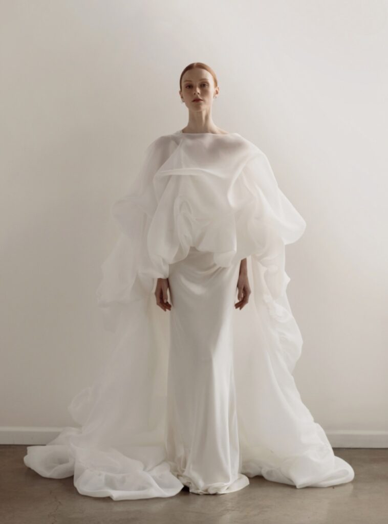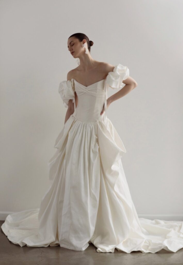 Designer Grace Jun’s Los Angeles-based label doubled down on dramatic architectural minimalism at New York Bridal Week, with fluid, sculptural shapes and voluminous sleeves, and designs including a strapless silk mikado ball gown with short puffy sleeves, an ethereal off-the-shoulder organza cape, and a tiered skirt paired with a boned bodice.