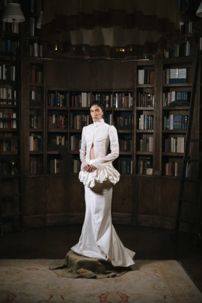 Fashion brand Batsheva Hay has turned its hand to bridal, showing a collection in collaboration with Michelle Copelman which maintained the house design language – prairie romanticism – with vintage-inflected gowns in silk duchess satin, moiré, and silk jacquard, styled as Victorian portraiture. Hay held the presentation in her own Upper West Side apartment, where models – including two recently engaged locals – tried on the collection.