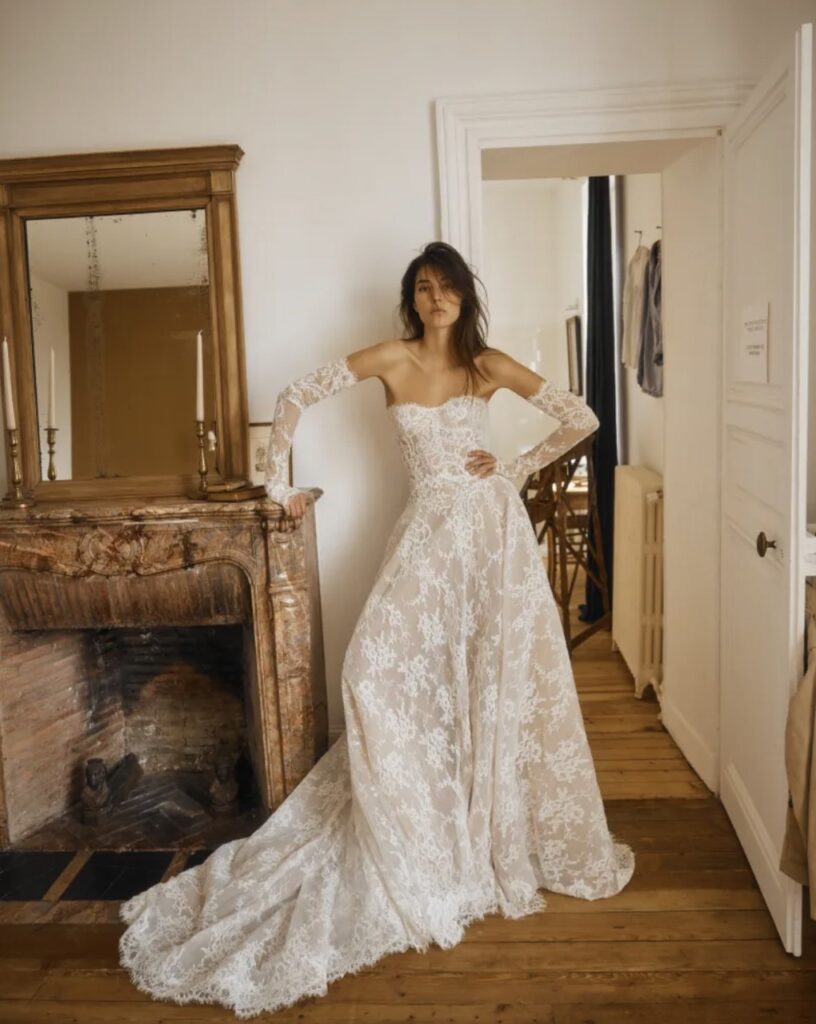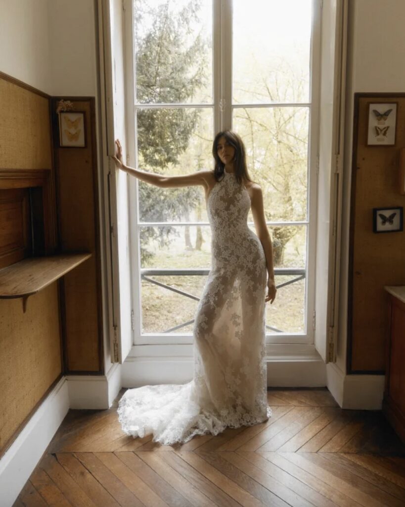 Dana Harel designs are for modern brides. The 2027 collection presented at New York Bridal Week leaned fully into both of the season’s resurgences: minimal designs with historical nods. Think corseted bodices, exaggerated hip pads and panniers, but also thoroughly contemporary clean lines and barely-there lace gowns, ideal for a destination wedding.