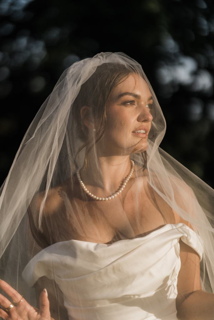 Light catches the veil and suddenly everything feels cinematic. There is a softness to it that instantly elevates the frame. It is romantic in the most effortless way.