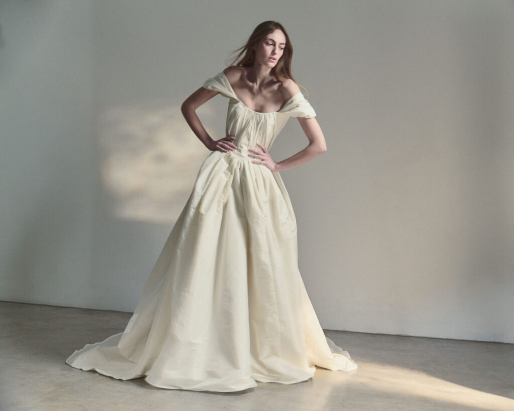 Sassi Holford‘s Sculpted Light collection offered a streamlined alternative with the Talia bodice: a silk-blend satin gazar with a basque waist indent, a Victorian-era technique that creates a similar hip-widening effect without the full pannier structure.