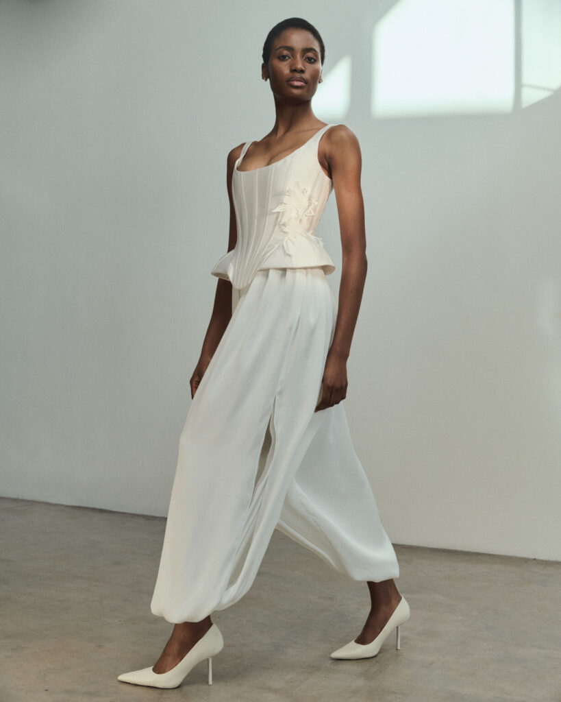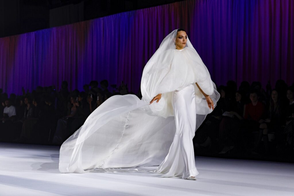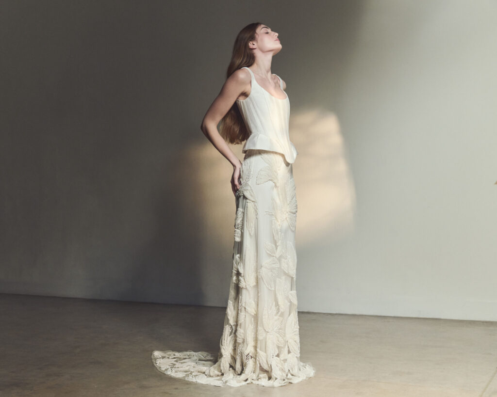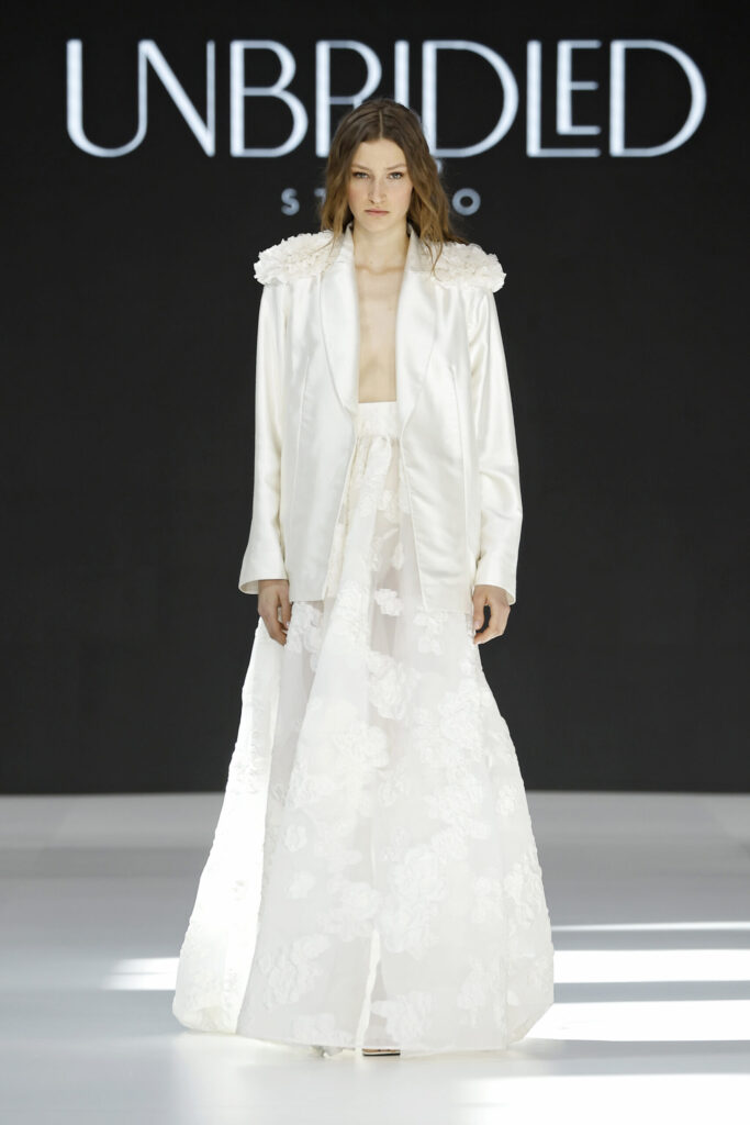 British designer Unbridled Studio took the opposite route, presenting an operatic embroidered cape dense with 3D flowers and designed to be removed after the ceremony, transforming the look from high-drama entrance to pared-back reception dress.