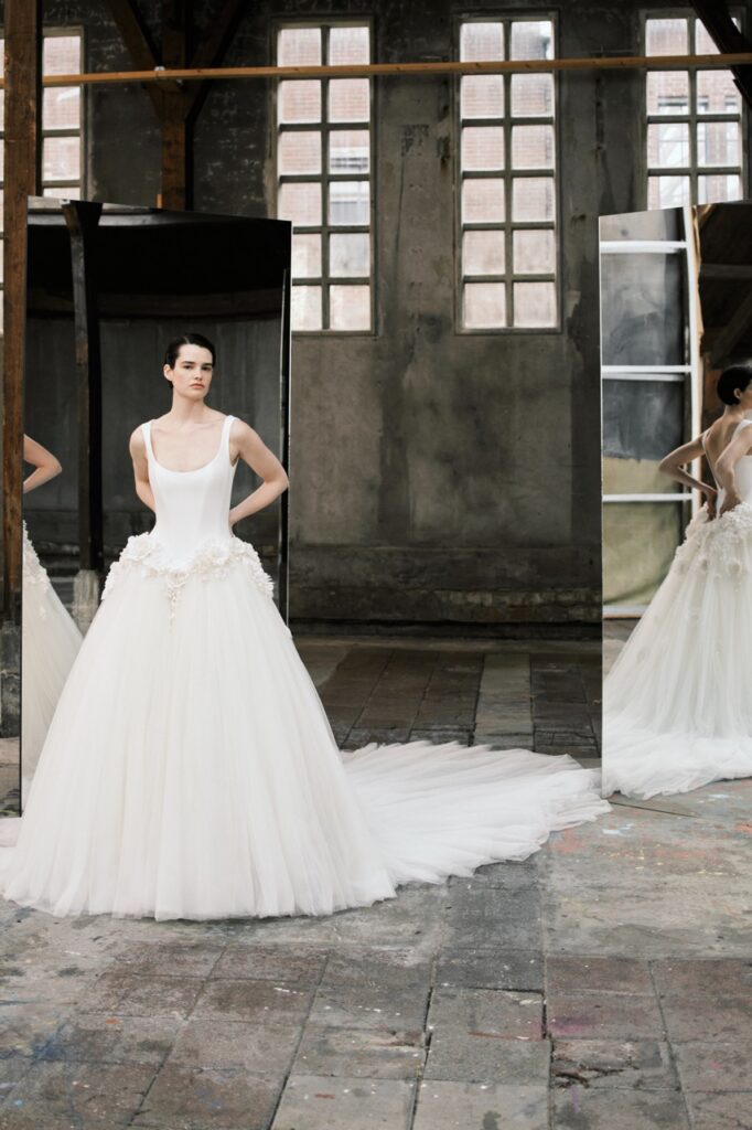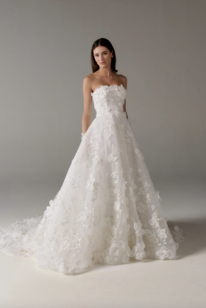 New York-based designer Poeza scattered 3D floral appliqués across both bodice and skirt to add textural weight, combining a clean silhouette in line with the house’s quiet luxury style, textured enough to create depth.