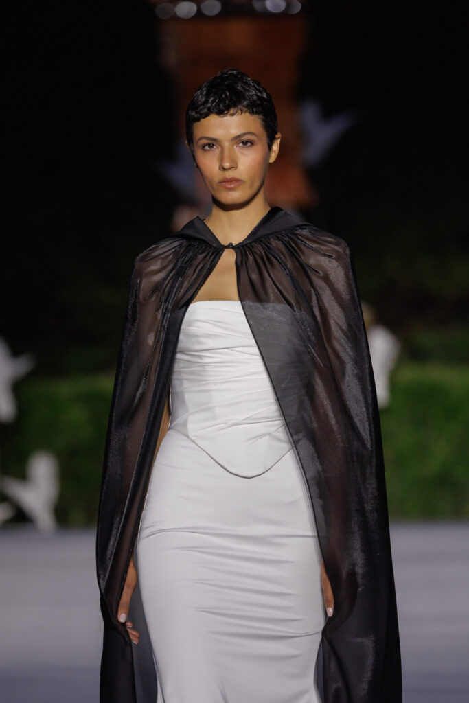 Oksana Mukha worked with sheer feathered capes that added texture and interest, and Stephane Rolland blurred the distinction entirely by embedding cape-like folds into the dress construction itself, making the cape part of the garment rather than a separate accessory.