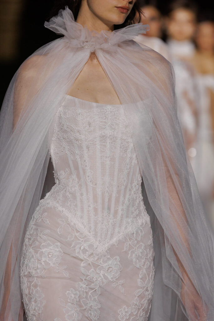 The cape emerged as the season’s most practical layering piece, allowing brides to shift mood mid-event without a full costume change. Ukrainian sister brands Woná Concept and Eva Lendel demonstrated the range with two opposing approaches: Woná Concept showed a black cape that read subversive against bridal white, and a feather-light tulle version draped over minimal slip dresses. Eva Lendel followed with simple draped capes in clean lines, prioritising fabric fall over embellishment.