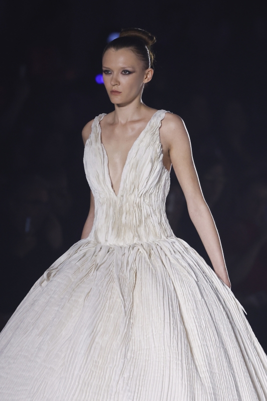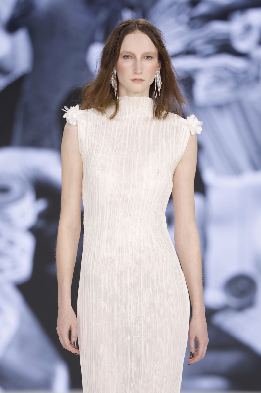 One of the purest interpretations came from Isabella Palacio, an ESDI design school student who opened for Stephane Rolland on Barcelona Bridal Night. She presented a fabric-forward approach with an organic plissé treatment and tactile crinkle effect that opened into a voluminous, textured skirt.