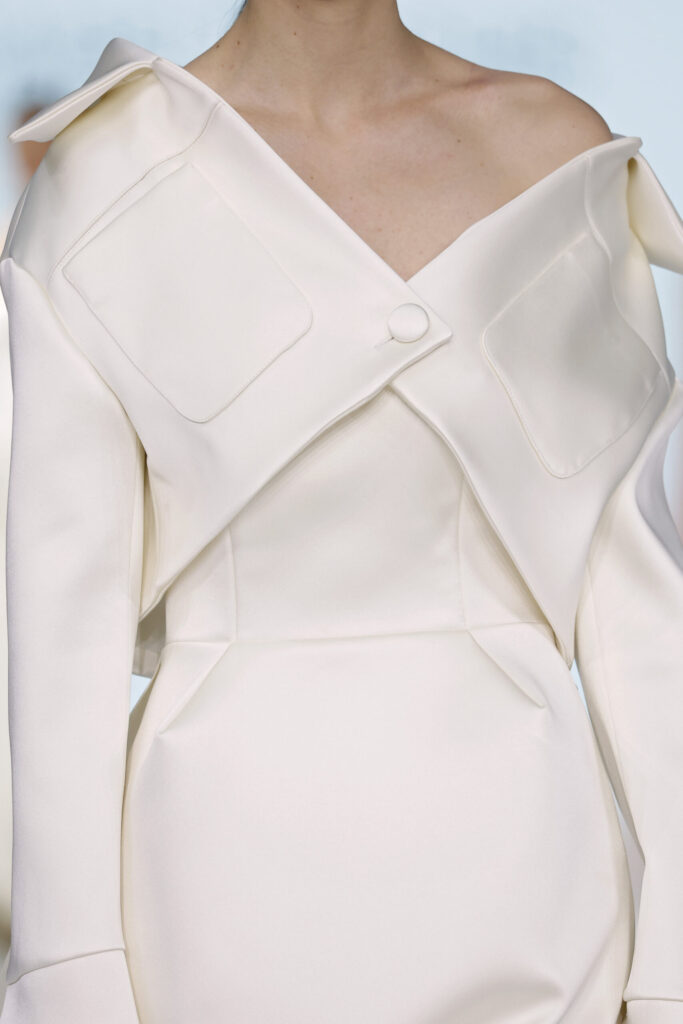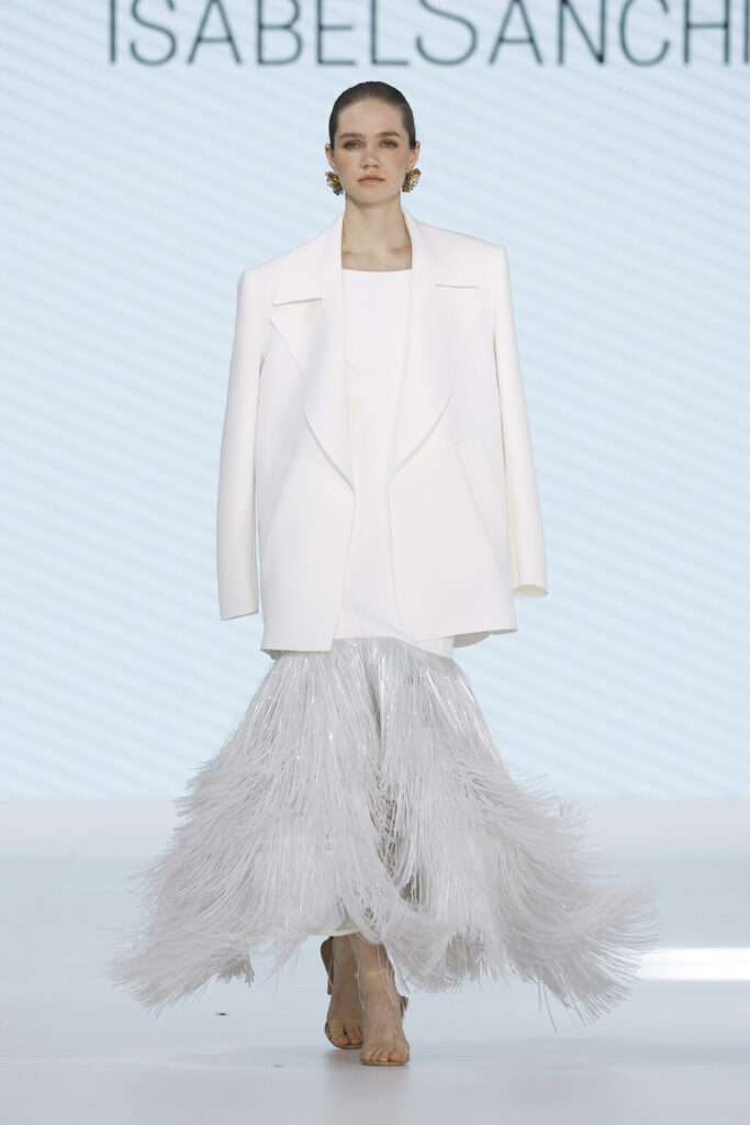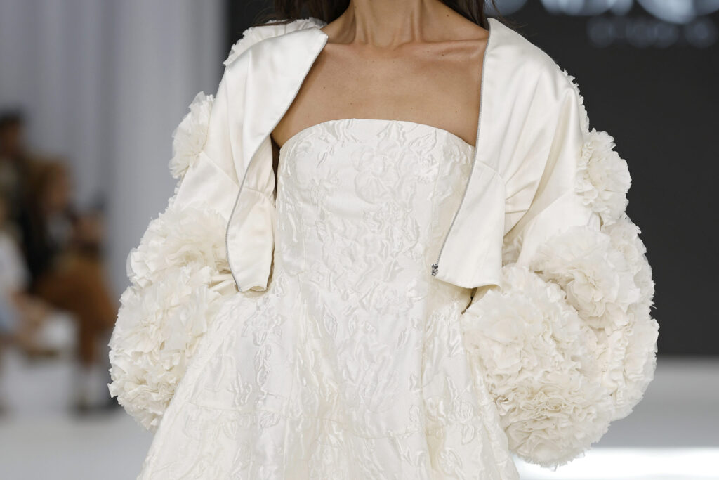 Tailoring appeared not as borrowed menswear but as architectural layering, offering brides modular options: blazers worn for the ceremony, removed for the reception, two looks without a full dress change. Barcelona-based designer Isabel Sanchis showed two approaches – a short embroidered bolero-style jacket with cap sleeves, and a deconstructed off-shoulder blazer with clean lapels and precise tailoring.