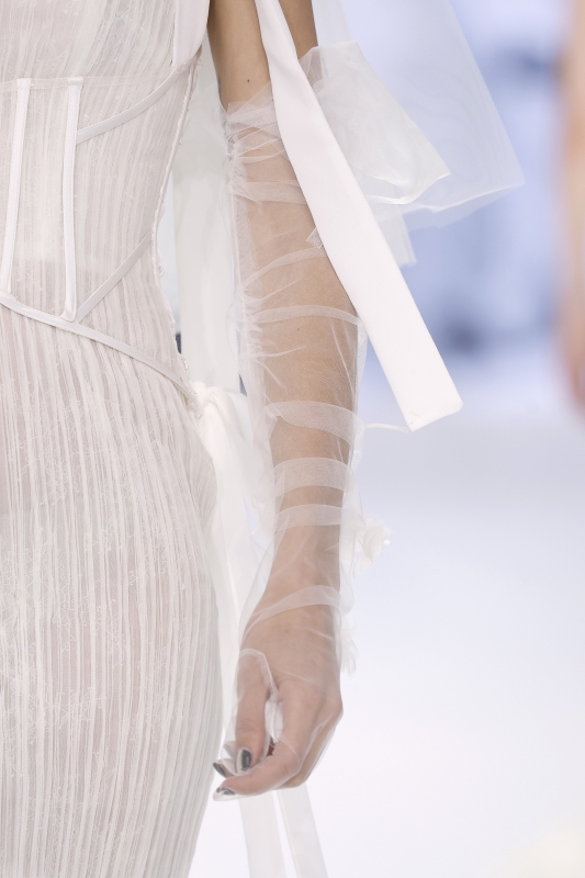 Viktor & Rolf Mariage and Stephan Rolland pushed flowers into structural territory: Viktor & Rolf embedded lilies of the valley, dahlias and roses beneath panniers to create volume from within, while Stephan Rolland attached oversized blooms at the waist to mimic pannier shape without the traditional understructure.