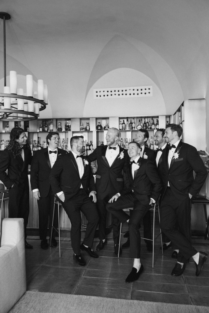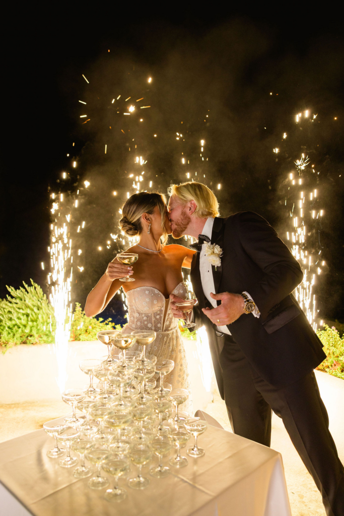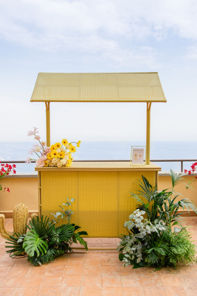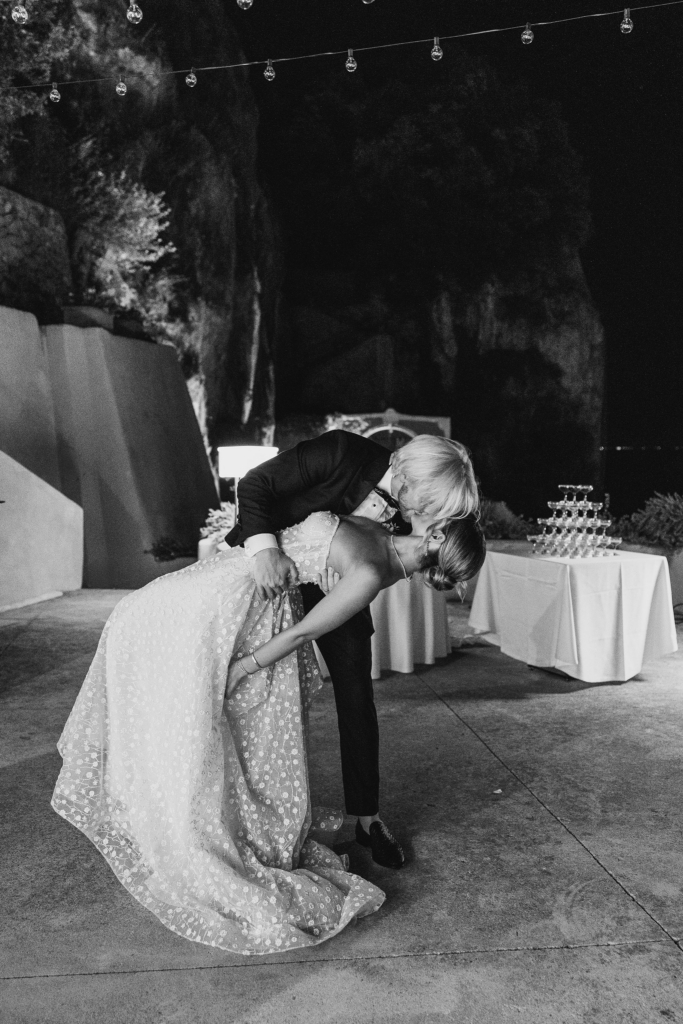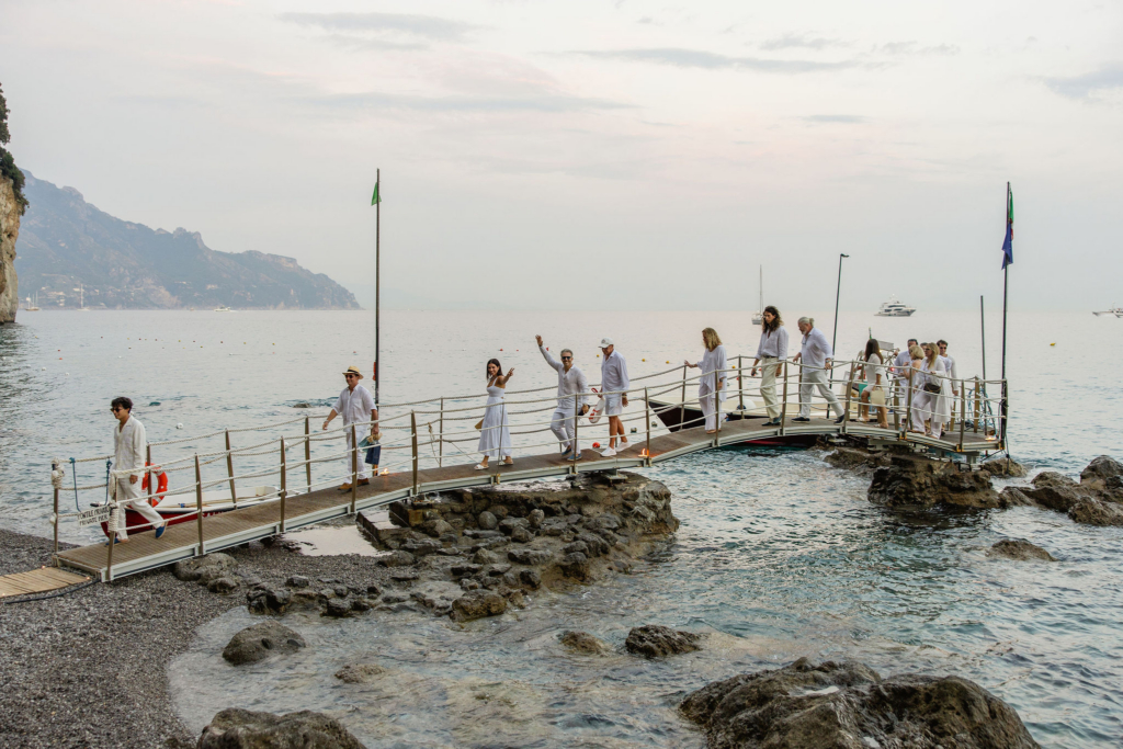 The days before were equally considered. On the 18th we hired three boats and spent the day on the water with friends and family, lunching at Conga di Sogno. The following evening, guests arrived in white to our welcome party at Lido Degli Artisti – a beach club where gold accents played against the rocky shoreline and the warm light of the Amalfi night.
