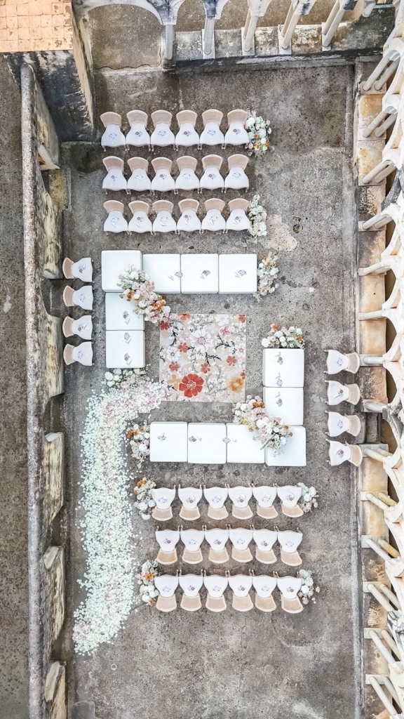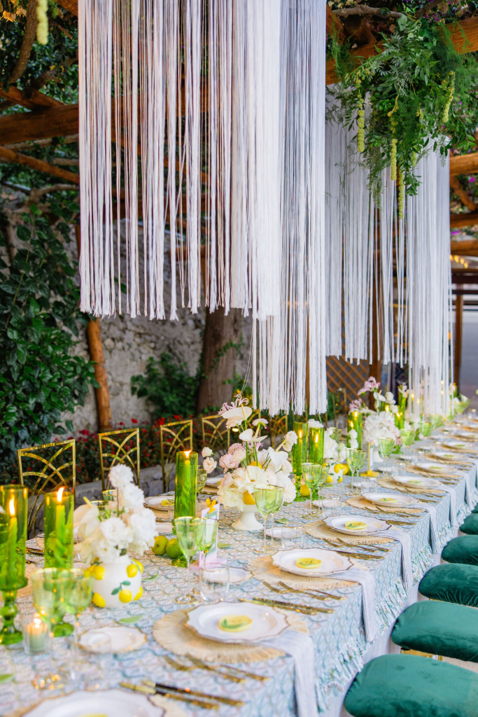 The welcome party was informal but considered: white and gold against the natural textures of a private Amalfi beach, with custom details drawn from Italian culture. For the wedding dinner, we worked closely with local artisans on everything – tablecloths, chandeliers, place cards, hand-embroidered linens and unique ceramic pieces.