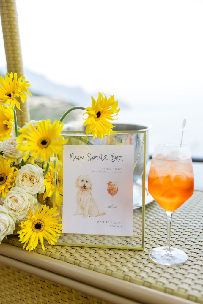 The welcome party ran on staple Italian cocktails – Lemon Spritz, Aperol Spritz, Espresso Martini – alongside pasta, calamari, antipasti, prosciutto e melone and eggplant flatbread. For the wedding aperitivo, the hotel created a bespoke Nobu Spritz Bar – named after our Goldendoodle, with his face printed on the napkins and drink stirrers.
