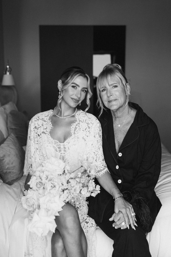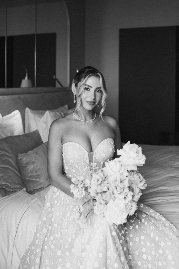 My wedding dress was the Hopkins by Pronovias – a flared silhouette with a sweetheart neckline and open back, worn with a Toni Federici veil and Prada shoes. For something blue, I had custom ‘I do’ underwear made by hand. After the ceremony I changed into the Heile Pants and Tank Set by Kyha Studio. My husband wore a custom Brooks Brothers suit with Magnanni loafers and a Jack & Miles feather bow tie.