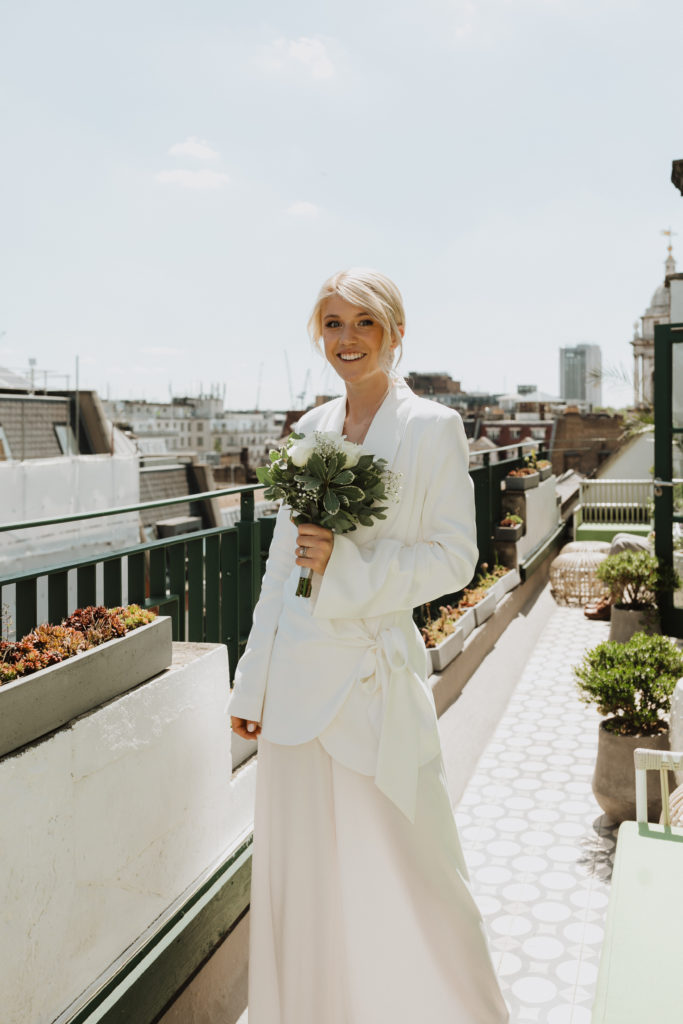 I opted for a chic and silky suit from Rat and Boa for our London wedding — something elegant yet not your classic wedding day attire, I fell in love with the suit the moment I tried it on, paired with my Amina Muadi heels, this look made me feel so graceful and it truly was the perfect suit for our legal London wedding… I’m saving the wedding dress for Italy!