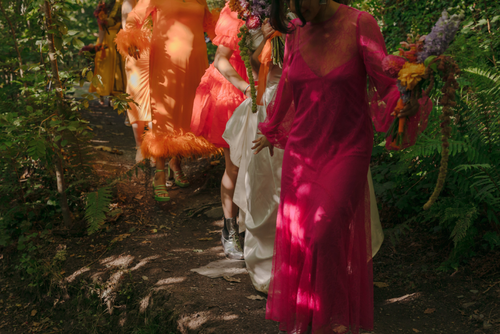 We had bridesmaids in all different vibrant coloured dresses to go with the colourful feel of the rest of the wedding. They were from all different places – from Sister Jane to independent Etsy tailors to Georgia Hardinge.
