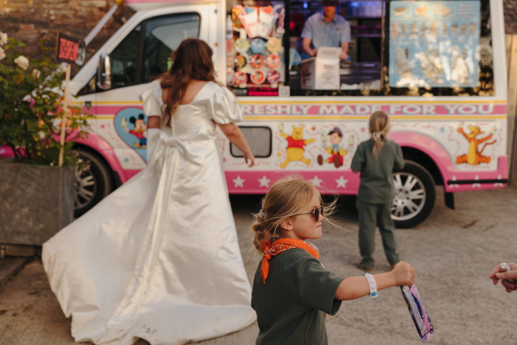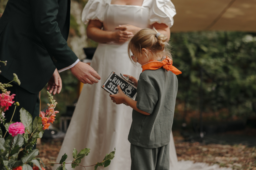 The page boys wore dusty green jersey co-ords, orange bandana neckerchiefs, and little beige Birkenstock mules. We made our page boys “Ring Security”; they had earpieces and took their job very seriously – people were even getting ID’d by them for donuts.
