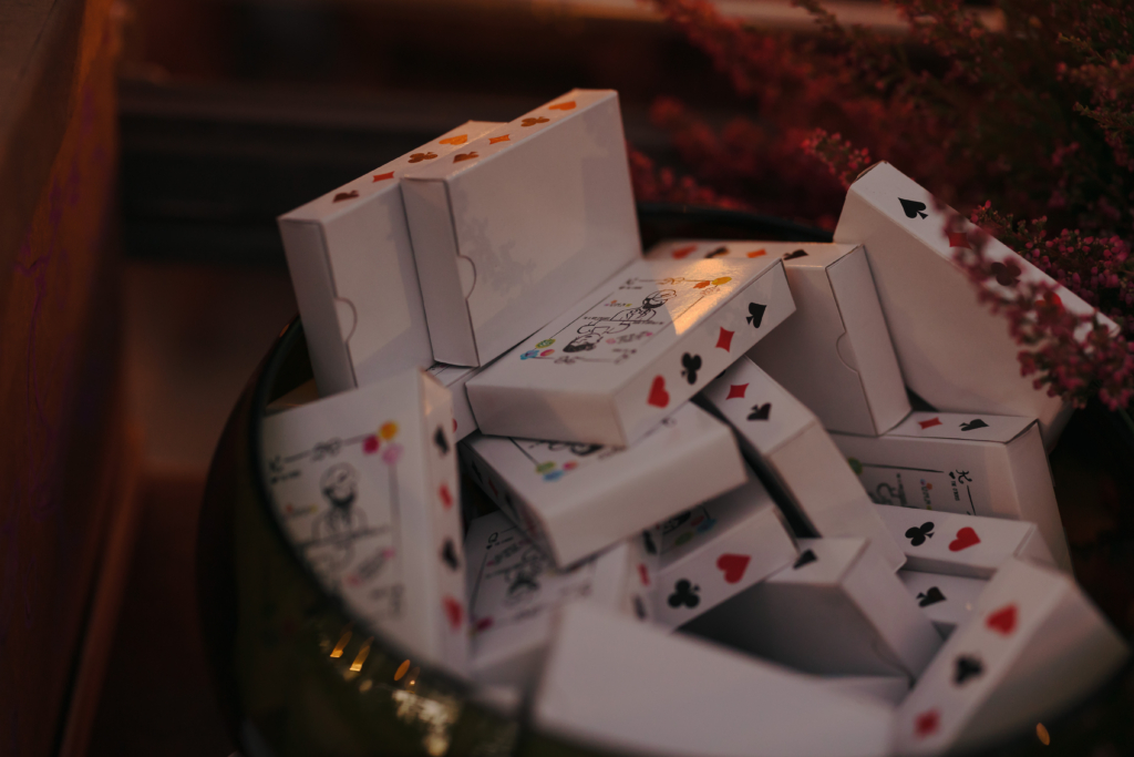 Aidan has always worked in the beer industry, so we had our own beer brewed by Anspach & Hobday, “The Disco Ball & Chain”, the label being designed by our friend Ty Cochrane. We had personalised matches and playing cards as favours too, as we love a holiday rummi championship.