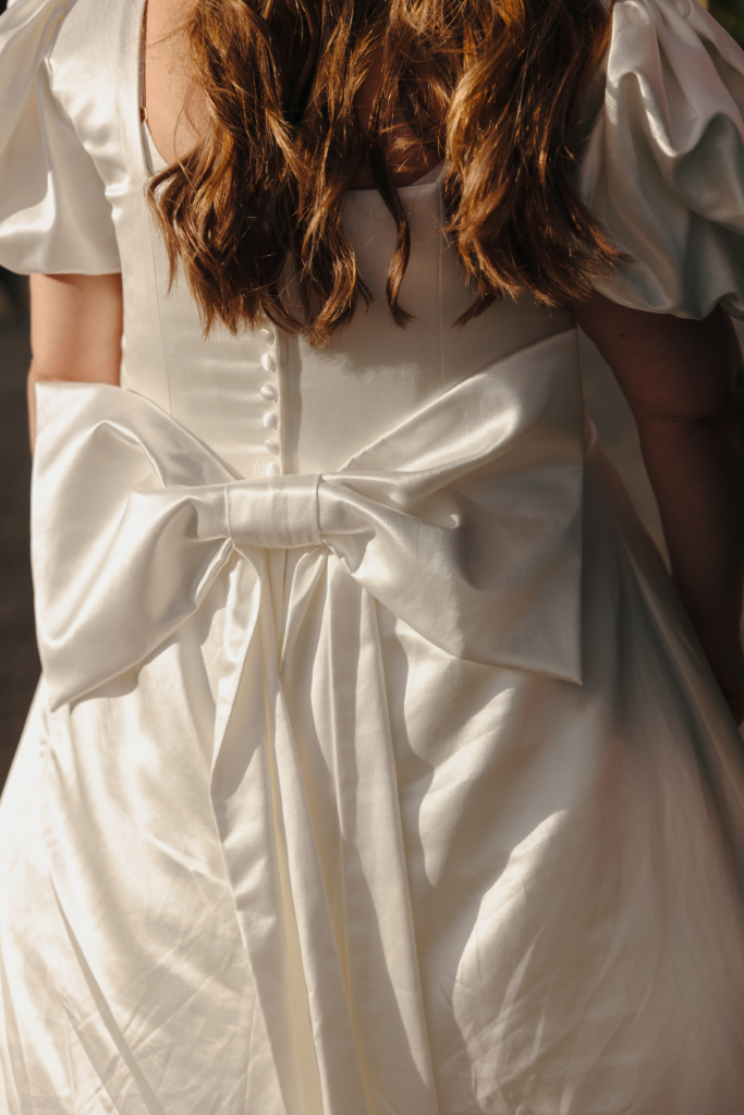 My dress was made by Lisa Lyons Montgomery. She was so wonderful to work with. I wanted a plain white fabric but big 80s puffy sleeves, a square neckline, an A-line skirt, a corseted top and a big detachable bow on my lower back – and Lisa delivered exactly that. She also made me a replica mini dress for the evening change.