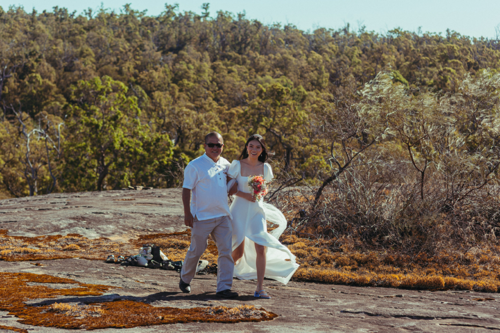 We got married on Sullivan Rock just outside of our hometown of Perth in Western Australia. We loved the venue because it wasn’t really a venue at all. It was a huge rock in the middle of the Australian bush. At the summit, you could feel the breeze from the coast and see the landscape shift from the coast to the interior. There is no shade on the rock, only lichen that was a strange blue – coincidentally matching the blue of Yux’s shoes. The day before we did a location scout and found a naturally formed rock altar near the summit.