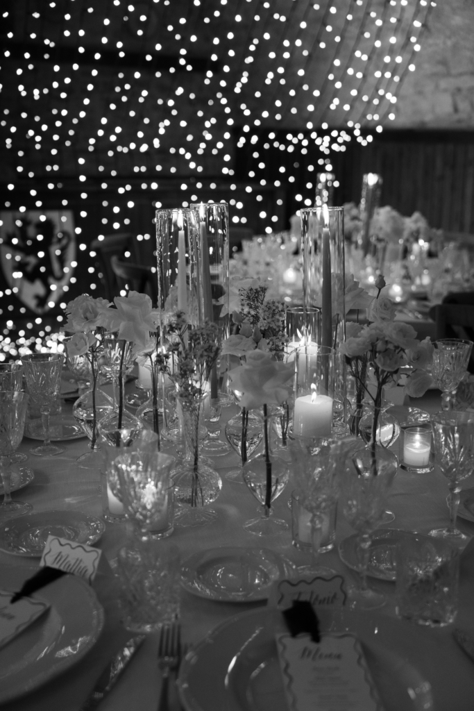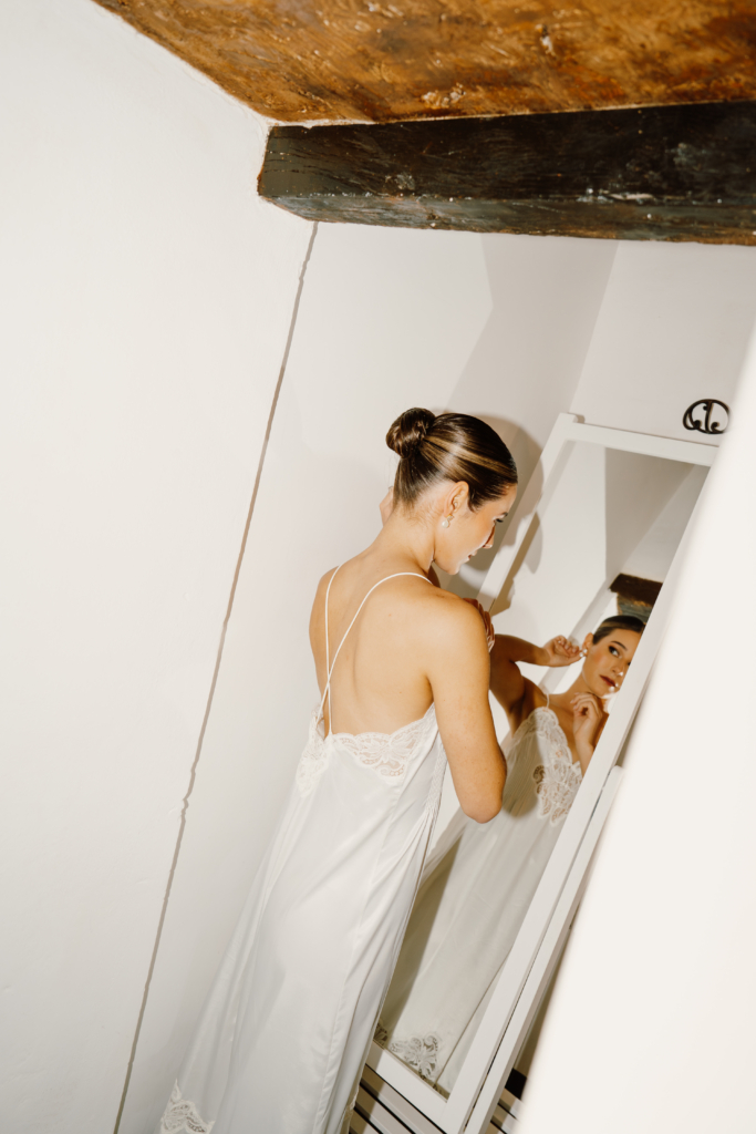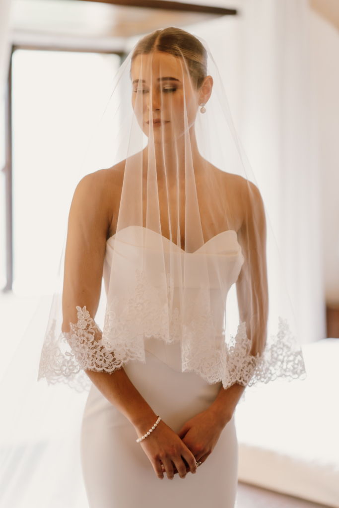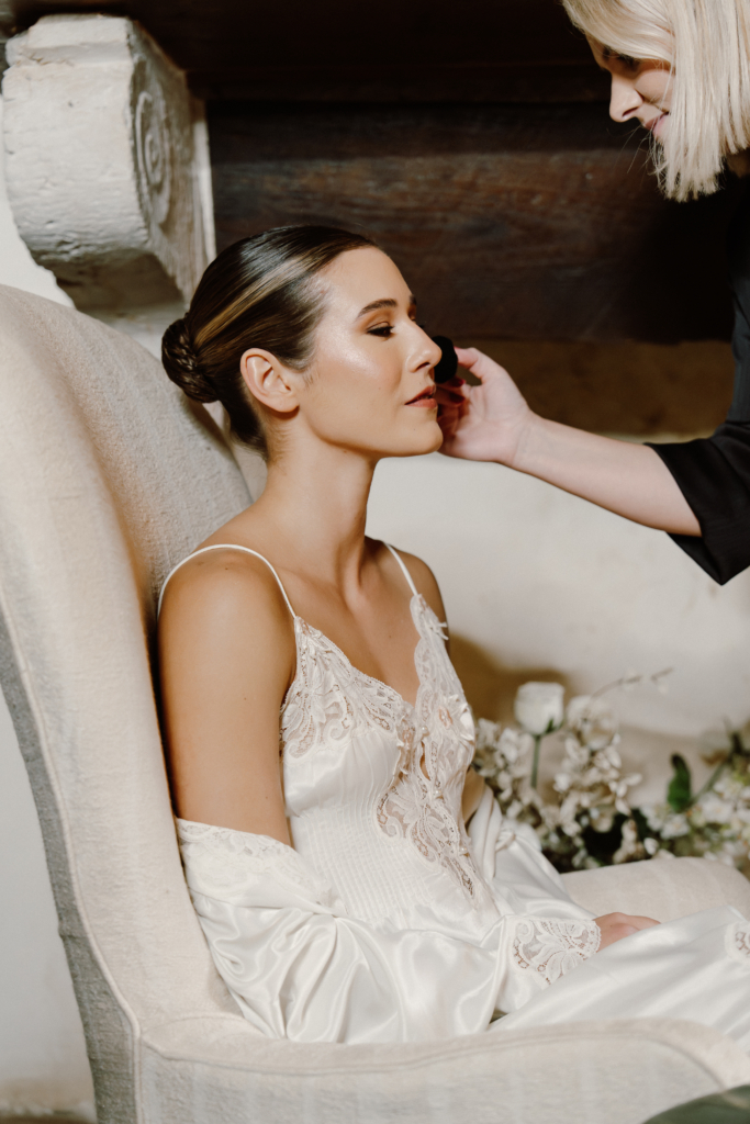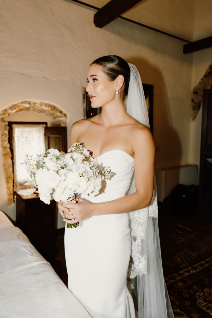For the welcome party, I wore a high-neck silk gown by Sau Lee. John chose a custom linen suit from Suitsupply. On the wedding day, I got ready in a floor-length silk gown and matching robe that had been passed down from my mom’s wedding. It was such a meaningful detail and felt incredibly special to wear. For the ceremony, I wore a strapless fitted dress by Madi Lane, paired with a cathedral-length lace veil. I wanted a look that felt elegant, simple, and timeless – something that would complement the rustic beauty of the abbey without overwhelming it.