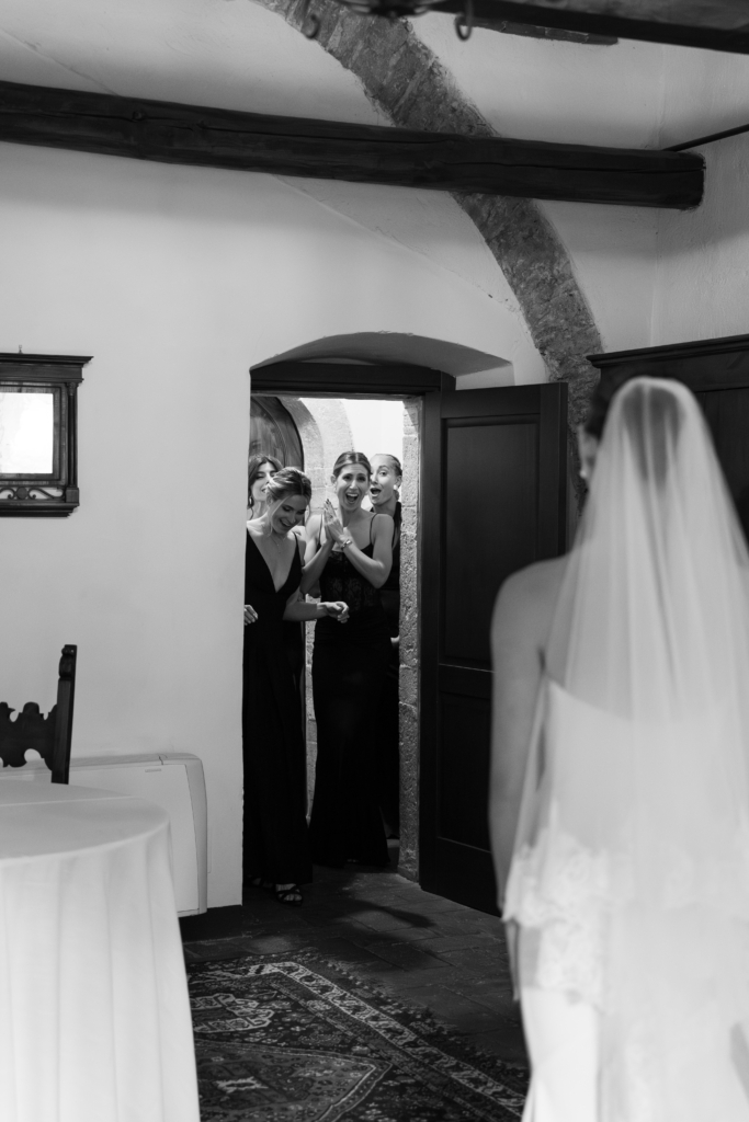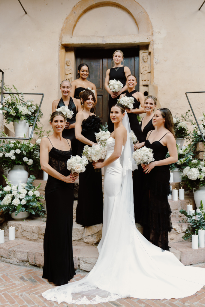 The bridesmaids wore classic black, and I let each of them choose their own dress so they could feel comfortable and confident in their look. The result was a stunning mix of lace, silk, ruffles, and chiffon – each one different, yet beautifully cohesive. Together, their individual styles created a timeless and elegant overall aesthetic.