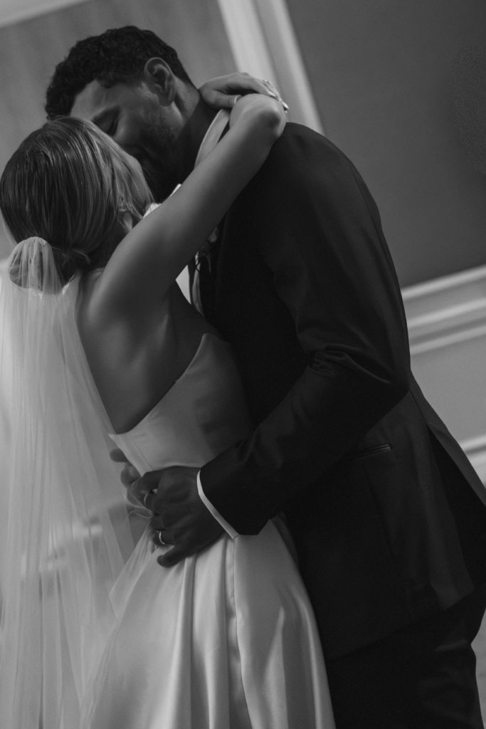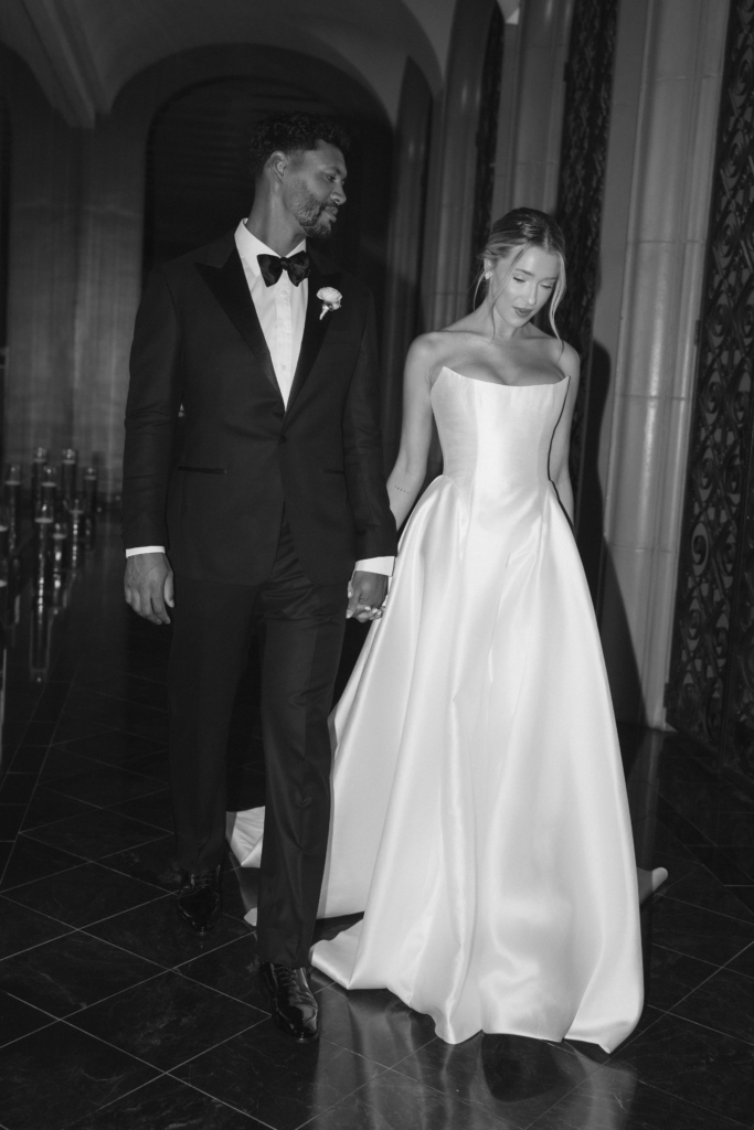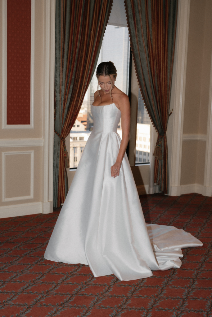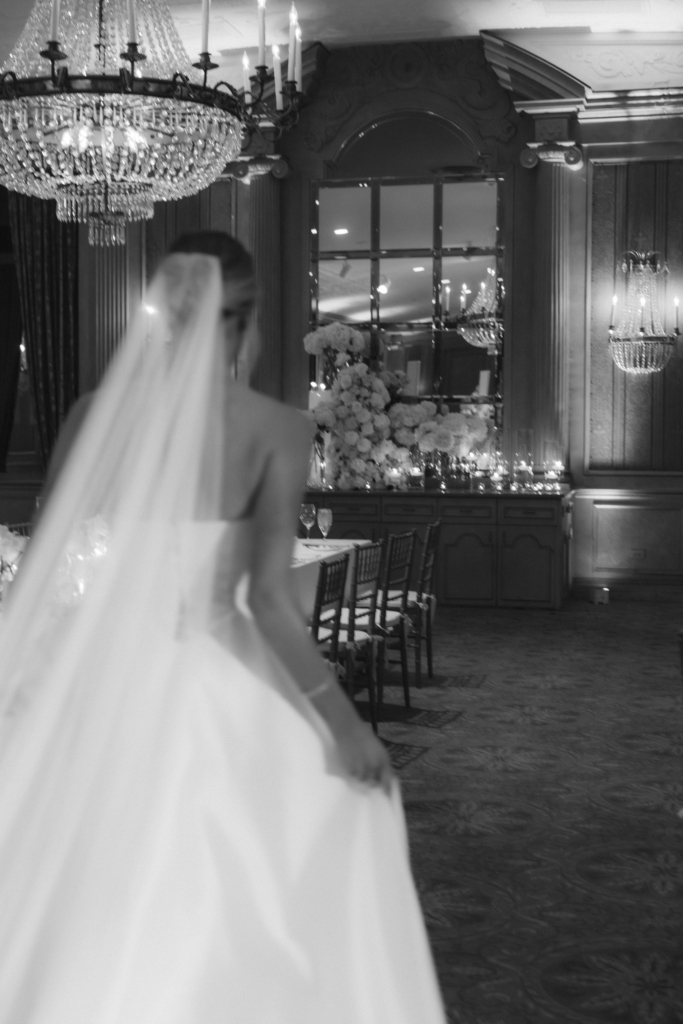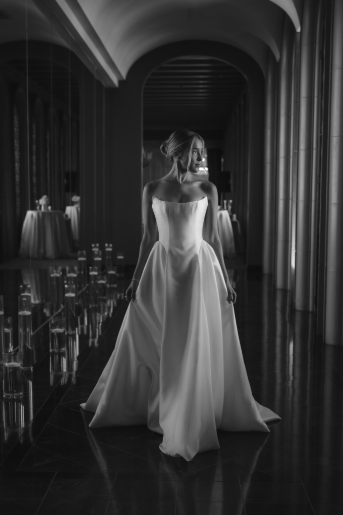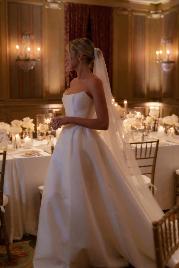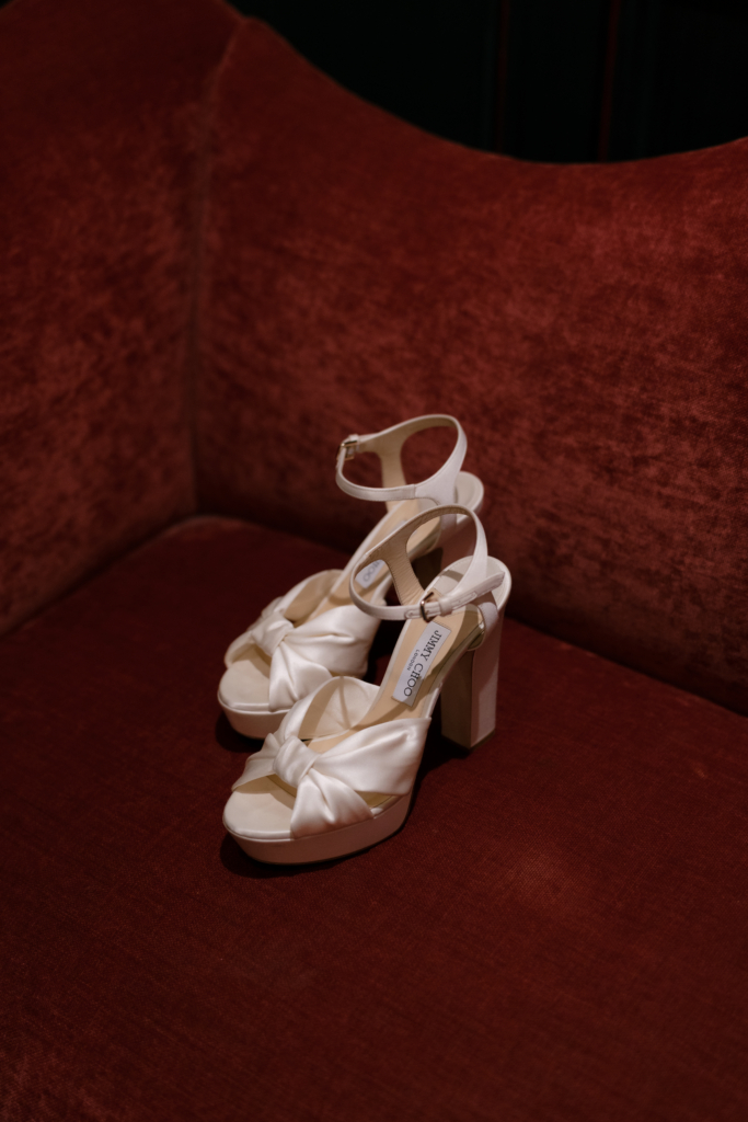 My mom and I took a trip to New York City earlier in the year to find my gown, and I spent several days trying on various styles, silhouettes, and fabrics. I didn’t go into gown shopping with much of a plan. Ultimately, on the last day of the trip, I tried on a gown by Maison Margot and immediately knew it was the one. It embodied minimalism at its best – traditional and contemporary all at once. The strapless bodice was cut with precision, offering a modern take on a classic sweetheart neckline that felt both structured and romantic. The gown cinched at the waist before releasing into an A-line skirt with a modest train, and the fabric subtly caught the candlelight as I moved through the venue. The dress was form-fitted to my exact measurements. I wanted something that would look just as chic 30 years from now as it does today. I paired it with sky-high ivory Jimmy Choo platforms and a long veil that melted into the train behind me.