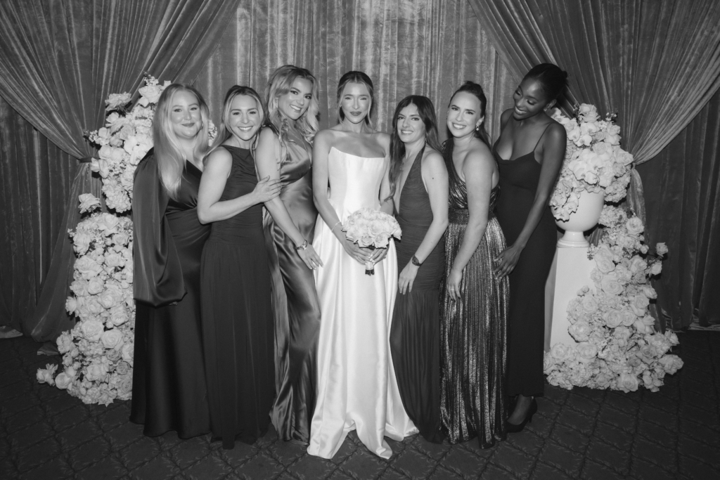 The dress code for guests was all-black, black-tie. To differentiate themselves, I had five of my closest friends wear chocolate-brown gowns of their choosing. They selected silks and feminine, draped silhouettes. I wanted them to feel free to choose something they felt beautiful in, and each opted for a slightly different style, which added a sense of individuality I loved.