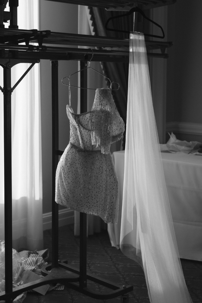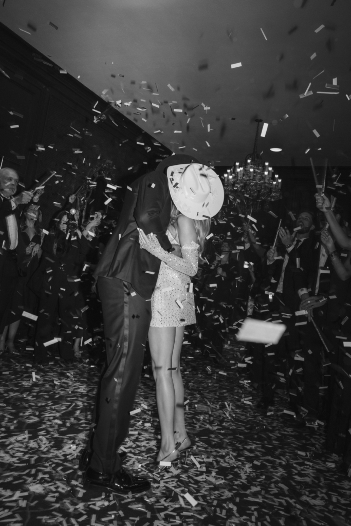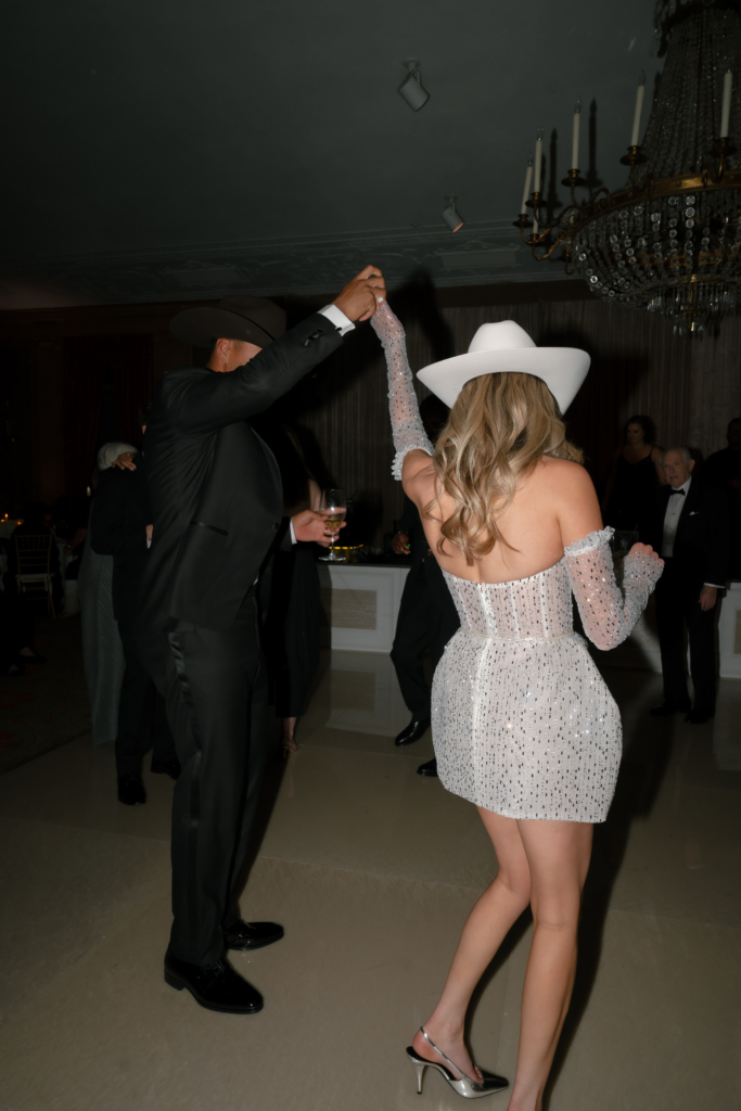 I changed into my after-party dress by Netta Benshabu – a modern showgirl fantasy filtered through a couture lens. The strapless, corset-inspired mini sculpted my body with architectural precision, blooming into a softly structured skirt. The icy champagne-toned mesh shimmered with micro-crystals and sequins like a disco ball. I transformed the original attached sleeves into detached, opera-length glove-style sleeves, sheer and delicately embellished. It was the total opposite of my ceremony gown, intentionally so. I paired it with a cream Stetson bridal hat and silver pointed-toe Saint Laurent heels. We opened a bar tab – everyone drinking classic Texas beer, me sipping a Shiner Bock in contrast to the couture – and spent the night two-stepping, laughing until our stomachs hurt, and listening to Wade Bowen. It was rowdy, joyful, and unmistakably Fort Worth.