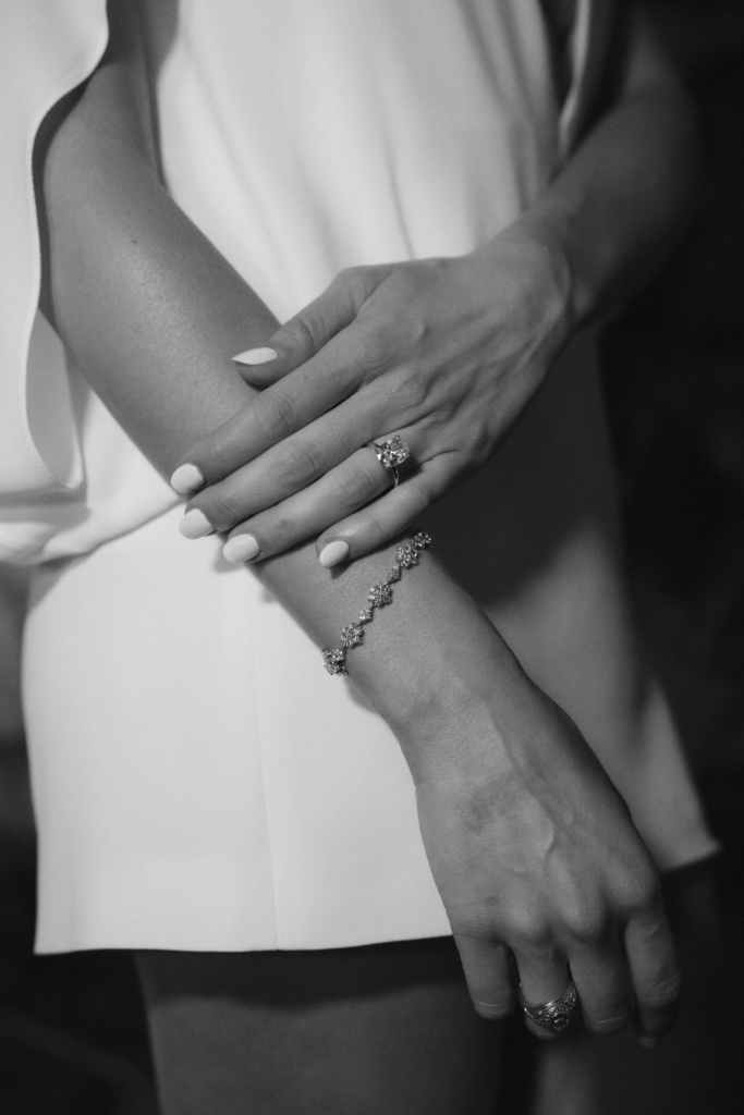 My jewellery was kept as simple as the dress itself. A pair of clustered diamond studs elevated my textured updo, and a diamond tennis bracelet adorned my wrist. For my “something borrowed,” I wore my grandmother’s yellow diamond ring on my right hand – a piece gifted to her by my grandfather, a true Texas oilman, to commemorate his first major success after starting his own company decades ago. It symbolized a moment that changed their lives forever and is incredibly meaningful to my family. Aside from my own rings, it was the most special piece I wore that day.