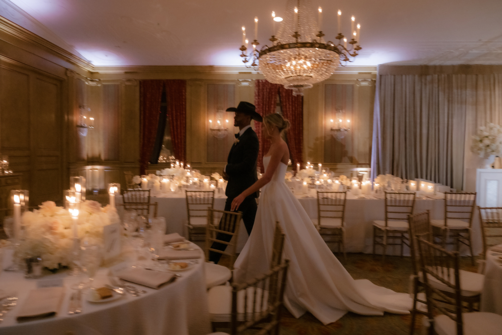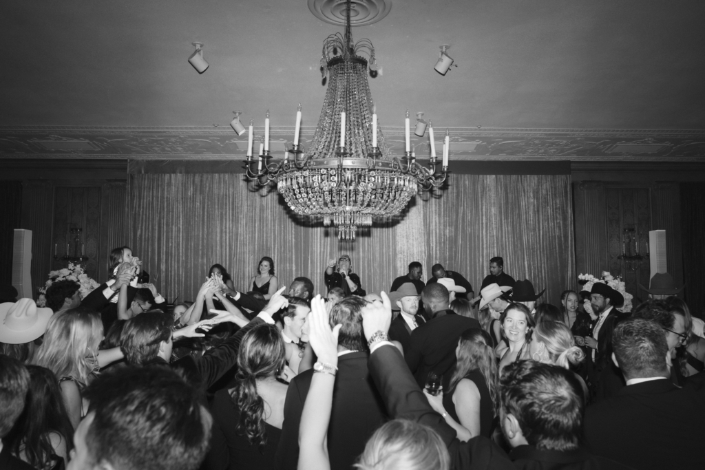 After the ceremony, guests moved through candlelit hallways into cocktail hour, where they enjoyed ranch waters, whiskey cocktails, caviar, and expansive charcuterie displays. From there, the space opened into the main ballroom with soaring ceilings, original 1920s architecture, and opulent chandeliers. We draped velvet behind the live band and kept the florals simple, allowing the room to speak for itself.