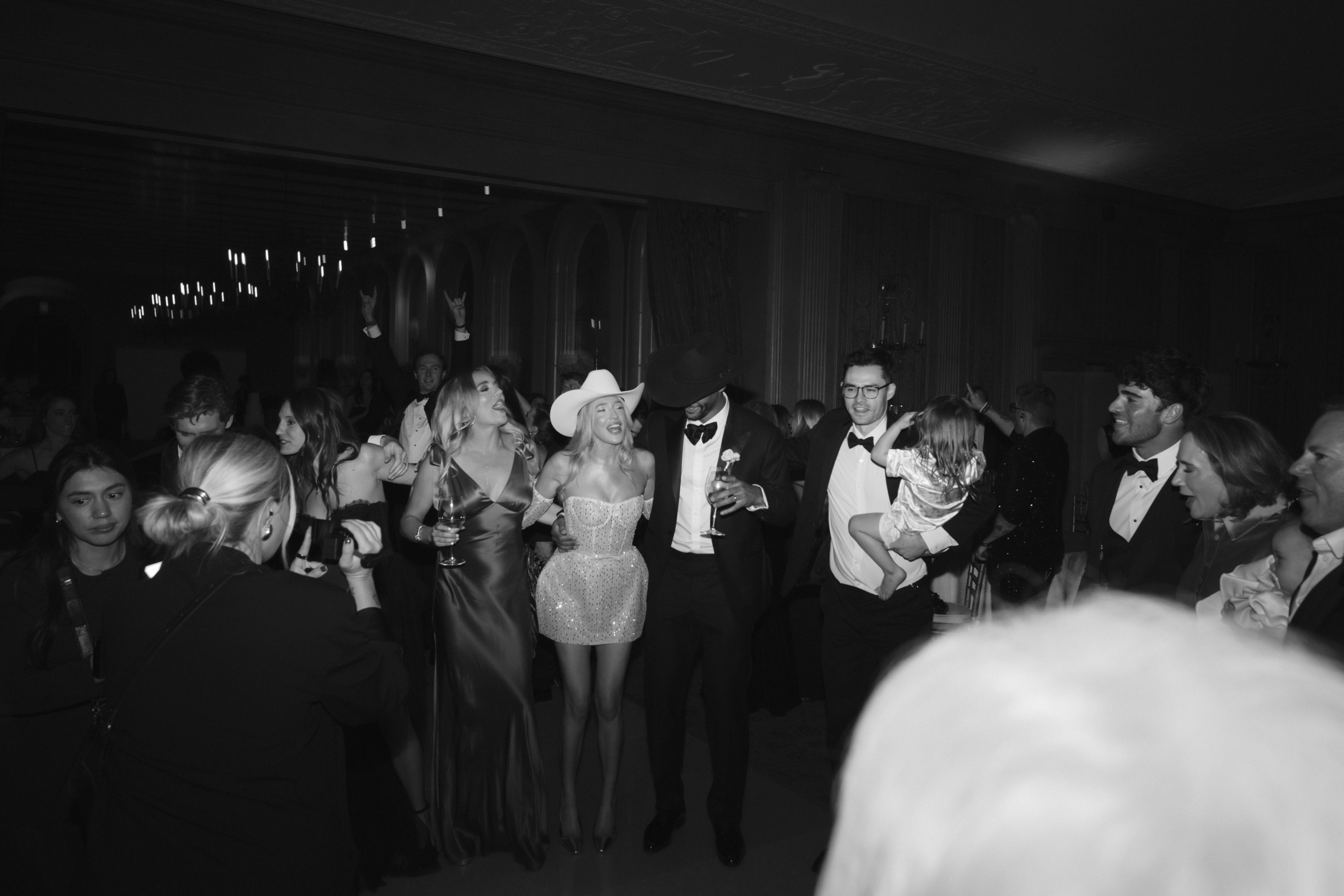 After the ceremony, guests moved through candlelit hallways into cocktail hour, where they enjoyed ranch waters, whiskey cocktails, caviar, and expansive charcuterie displays. From there, the space opened into the main ballroom with soaring ceilings, original 1920s architecture, and opulent chandeliers. We draped velvet behind the live band and kept the florals simple, allowing the room to speak for itself.
