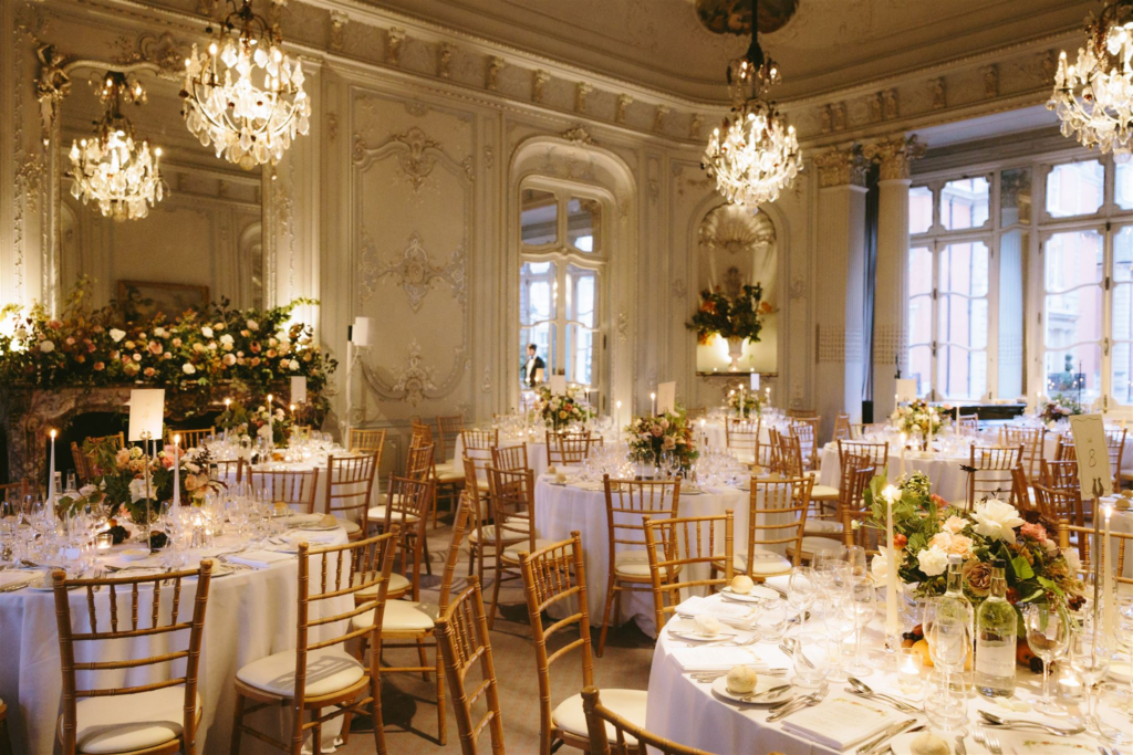 We chose The Grosvenor Chapel in Mayfair for its beautiful architecture and iconic ties to the area. It also happens to be the chapel from Love Actually, which made it even more special. The reception was held at the Savile Club, a five-minute walk from the church. We fell in love with the ballroom’s frescoed ceiling and mirrored dining rooms—perfect for our candlelit autumnal dinner party. The Michelin-starred chef’s bespoke menu sealed the deal. The day before, we hosted a champagne afternoon tea at The Beaumont Hotel’s Gatsby Room—a highlight of the weekend.