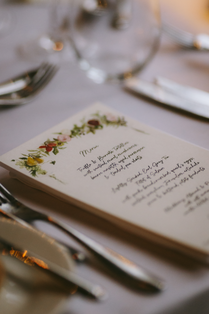 I was inspired by Dutch master paintings, incorporating autumnal fruits and flowers. Our florist, Sarah, understood my vision and brought it to life beautifully. From delicate bouquets to surprise urns at the chapel entrance, the atmosphere was magical. The Savile Club ballroom exceeded all expectations with elegant flowers, foliage, fruit, and candles. The staircase adorned with soft pinks and autumn hues was a fairytale setting for our guests. I designed all the stationery myself, creating whimsical watercolour illustrations for the invitations, order of service, menus, and place cards. This labour of love inspired me to launch Studio Sumerfield, offering bespoke wedding stationery.