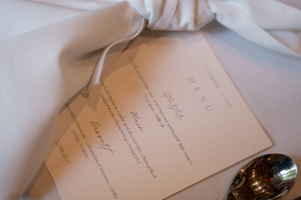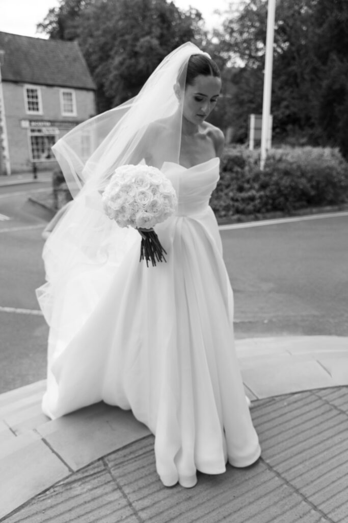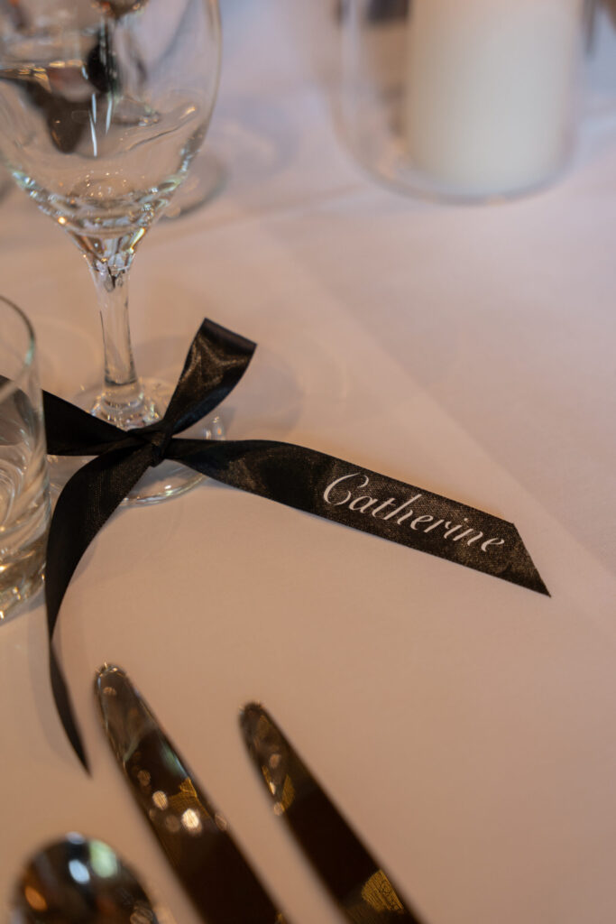 My brother-in-law’s mum did our flowers. She’s called Adrienne’s Flowers and our brief was very simple, just lots of white garden roses. I wanted a big bouquet and then everything else minimal on our tables and the groomsmen’s buttonholes. We used lots of lanterns and candlelight to create a romantic atmosphere. We didn’t have anything in the church, it was beautiful as it was, and honestly, I saw it as an area where we could save money. I always wear black, brown or white, so the flowers needed to be classic and elegant. We bought black ribbon from Hobbycraft and Jack’s sister Rosie printed people’s names on them. We then attached them to wine glass stems at everyone’s place setting. With the white linens, it was very monochrome.