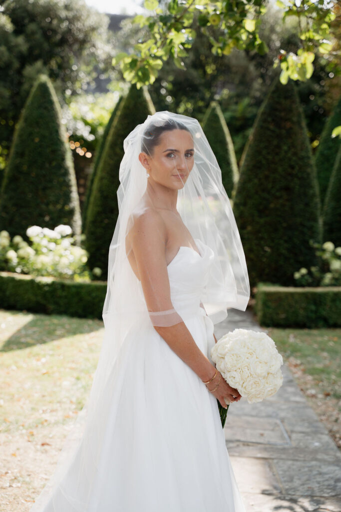 I only visited two bridal boutiques. Satin Bow in St Albans because they stocked Pronovias and Ellie Sanderson in Beaconsfield. I tried on about 20 dresses in total including ones from Suzanne Neville, Jesus Peiro and Kyha Bride. In the end I chose the organza Lana dress from Champéry from Ellie Sanderson. I remember trying it on and a woman walked past the window, stopped and gave me a thumbs up. I felt quite emotional when I put it on, I literally loved it. I added one of Ellie’s cathedral length veils and white satin court heels from Linzi Bridal from Next.
