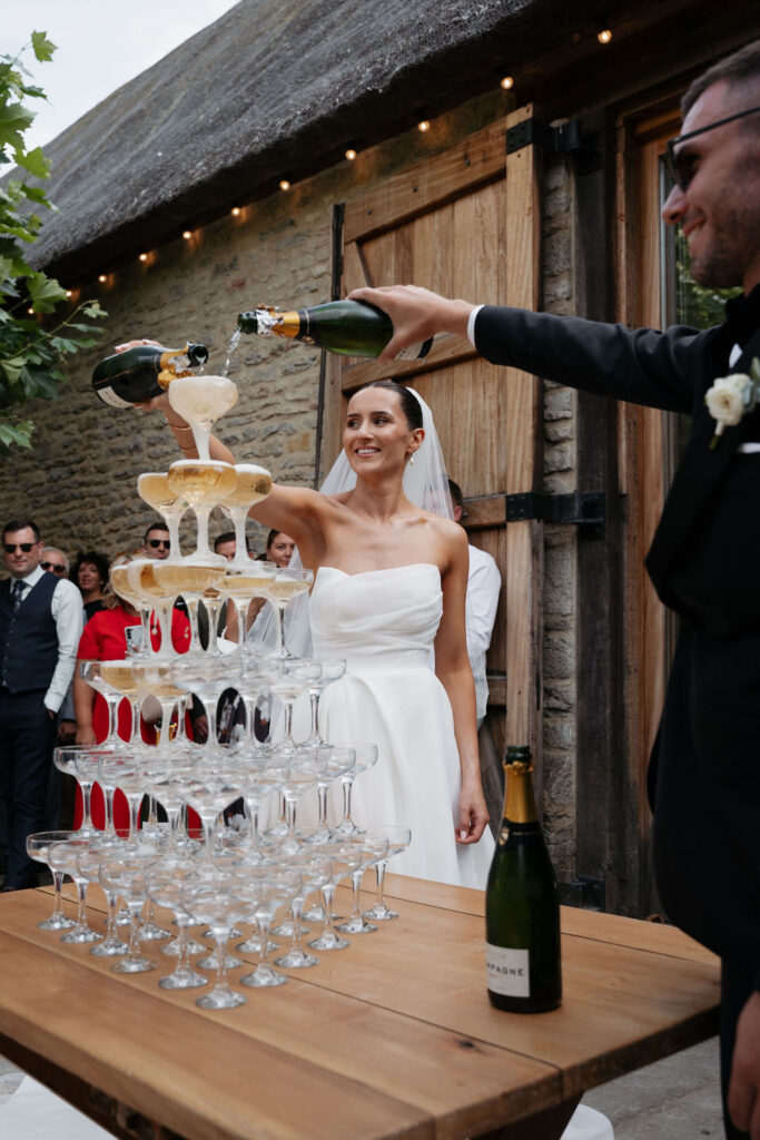 I wanted the formality of a plated menu rather than sharing dishes and what Absolute Taste created for us was unbelievably good. We started with a cod and prawn Thai fish cake followed by cornfed chicken terrine with a chicken leg croquette. Dessert was chocolate brownie with caramelised banana, vanilla and crème fraiche. We decided against a wedding cake in favour of a Champagne tower which we served just before the meal to get the party started. My only regret is that I never stopped to eat any of the farm cooked pizzas later that evening. I was too busy living my best life on the dancefloor.