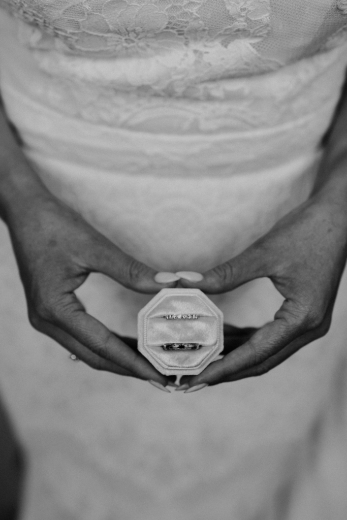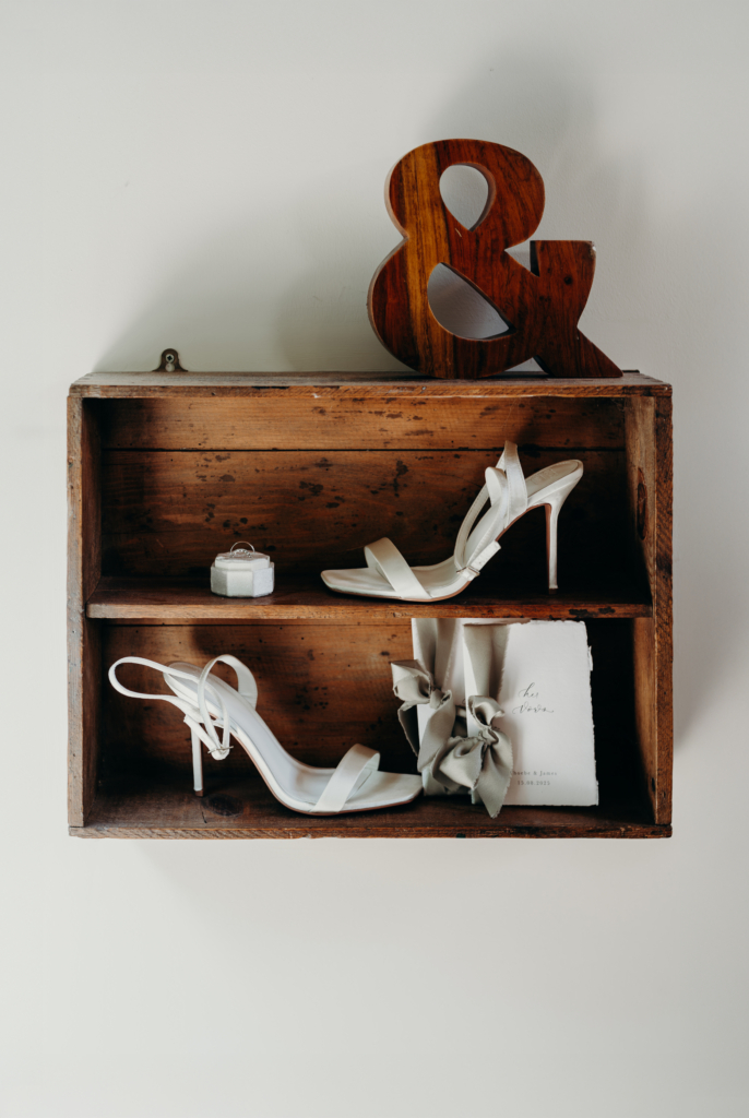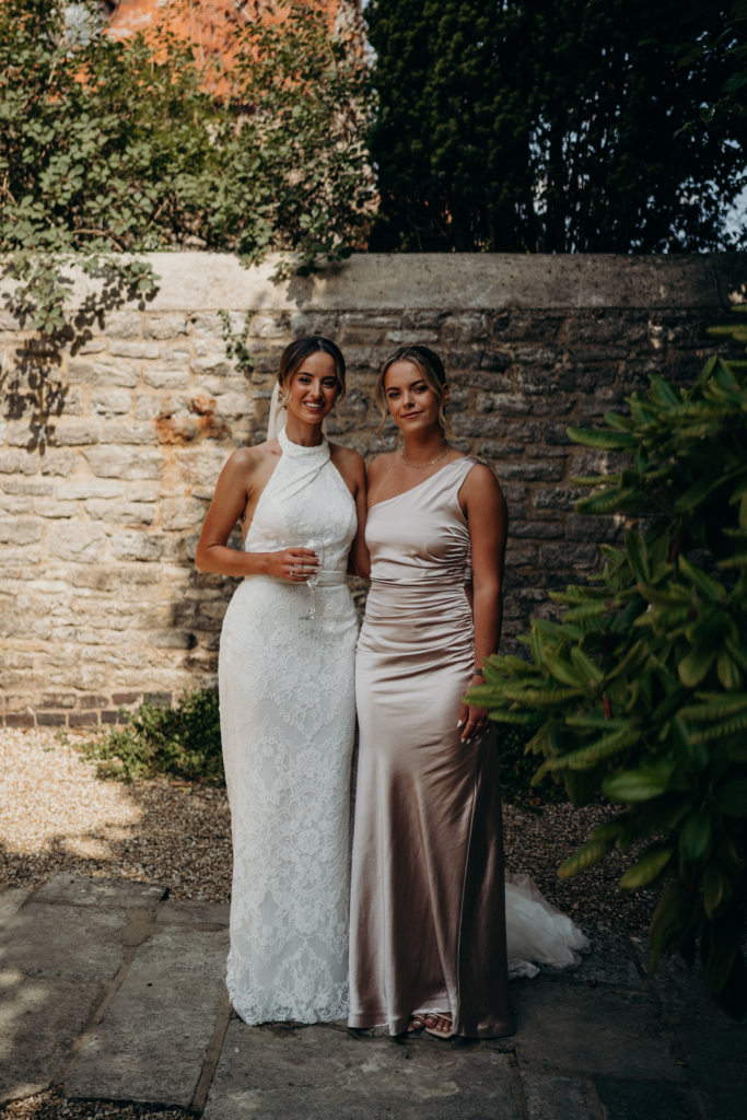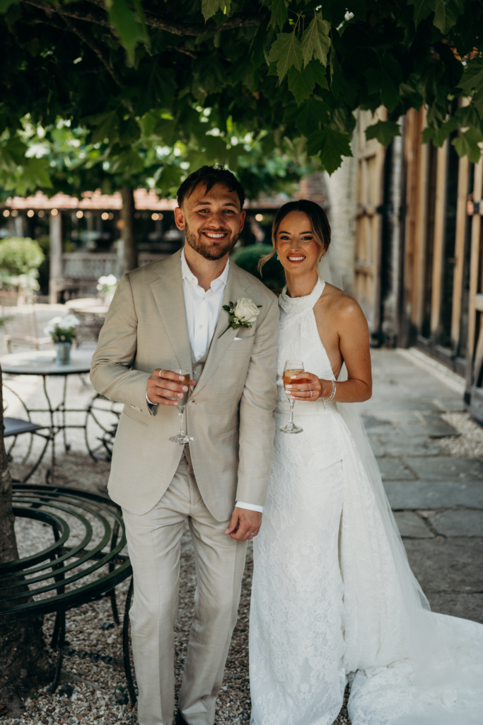 I loved the idea of buying my dress from an independent bridal boutique like Lauren Francis Bridal in Dorset. It was the first and only shop I visited. I arrived convinced I’d buy the Grayson dress, by Made With Love bridal, a full length, halter neck crepe gown with an additional crepe overskirt. I loved the neckline, but something wasn’t quite right. So, I tried the same dress in lace, called Hallie. It was the last dress I tried on and I fell in love with it. They didn’t offer the overskirt in a lace, so I had it made bespoke. My shoes were plain satin and open toed from ASOS with a manageable four-inch heel.