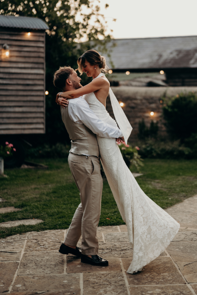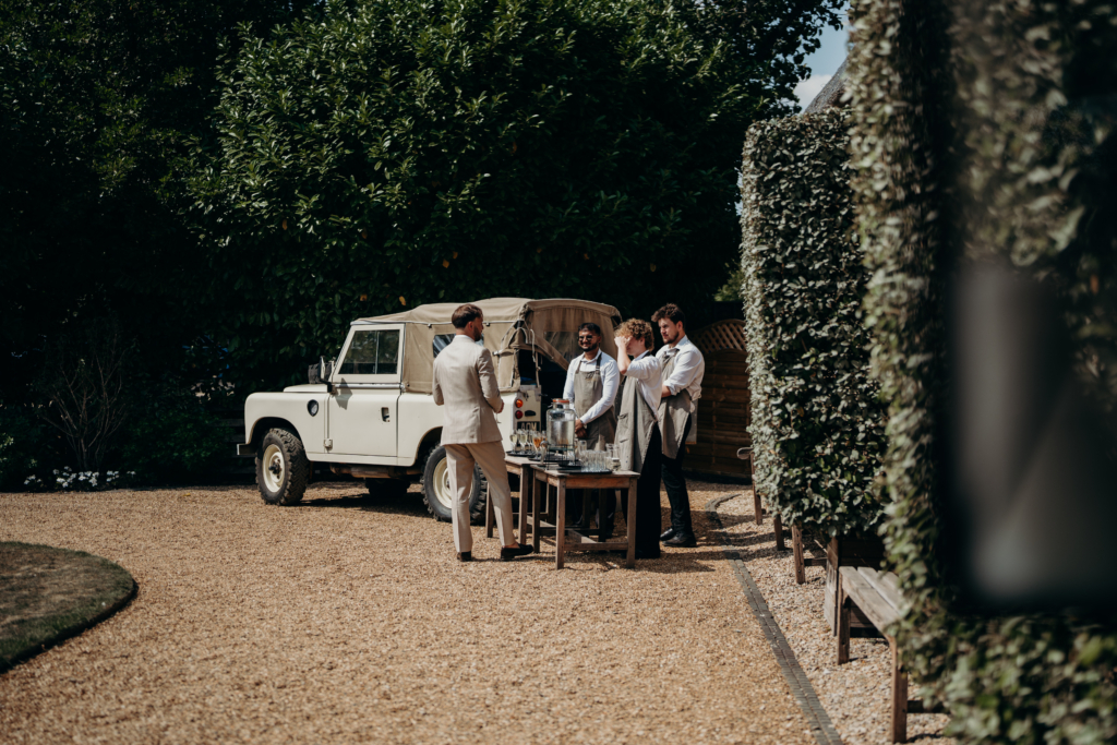 We got married at two o’clock in the 14th century thatched barn under the glow of five antique crystal chandeliers. Guests were served pink prosecco or elderflower fizz from the back of a vintage Land Rover as our violinist played. It was a scorching hot day, and we were so grateful for the shade of the pretty gardens. The wedding breakfast was at 4pm, a hearty menu of fish cakes, roast chicken with dauphinoise potatoes and sticky toffee pudding. We all tucked into pizzas from the Cowshed pizza oven later which really hit the spot.