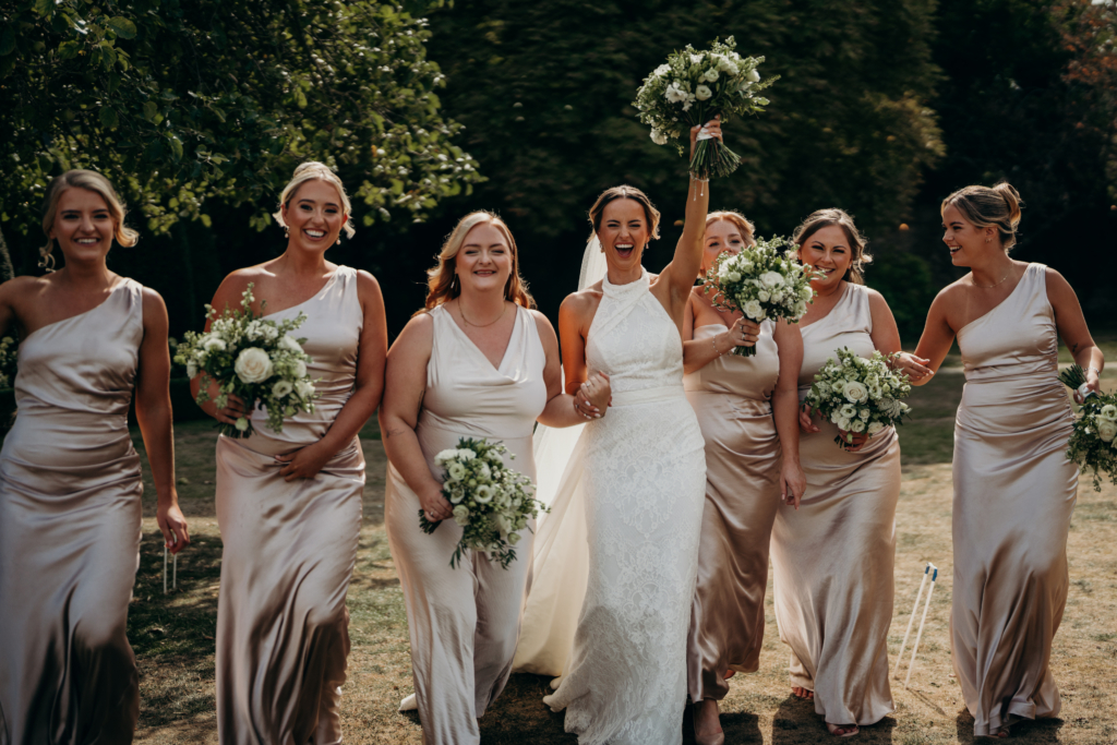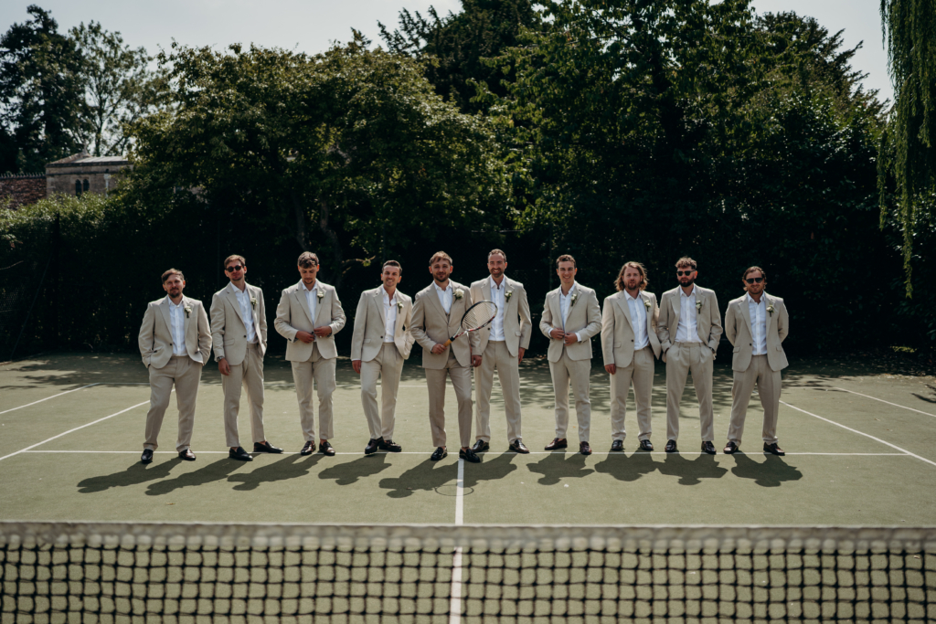 I had two maids of honour and four bridesmaids while James had nine groomsmen. The girls all wore the same style oyster-coloured dress from Six Stories – with one exception who had a cowl neck design after a last-minute change to a style that fitted her better. All the groomsmen’s suits were from ASOS too. We bought them for £130 each, about what you would pay to hire a suit and this way they could all wear them again. They were a linen/wool blend in beige and suited the day perfectly. My dad’s and James’s suits came from Suit Supply in Westfield where they tailored them to fit perfectly. You can create a suit from scratch, and they have an vast range of fabrics.