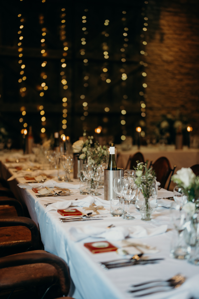 Our colour scheme was very neutral with pops of natural green which worked brilliantly with the farm setting. Joanna Carter Flowers was phenomenal and so patient as we changed our minds repeatedly. She arranged lots of candles and glass bud vases along the banquet stye tables and managed to reuse all the bridesmaids and my bouquet which helped stretch the budget and gave us a great mix of hydrangeas, garden roses and wax flowers. We added our own white tablecloths to prevent the overall look being too rustic. At every place setting we had a handwritten, personalised letter to each guest and signed from Mr and Mrs Nally which felt like a special touch with edible favours from Biscuit Boutique.