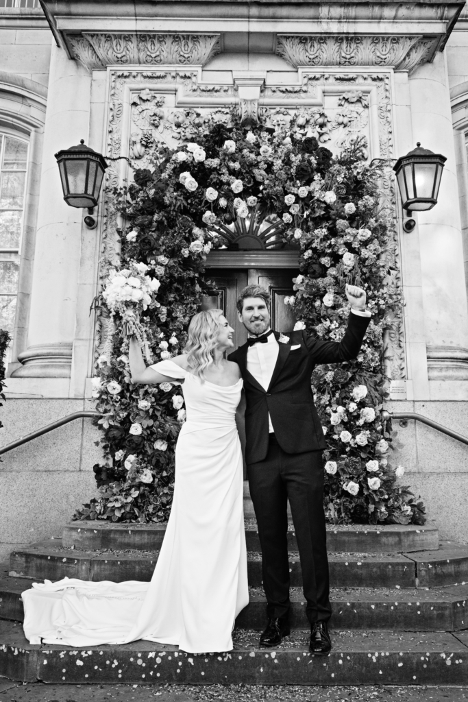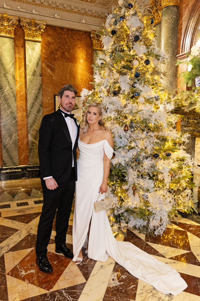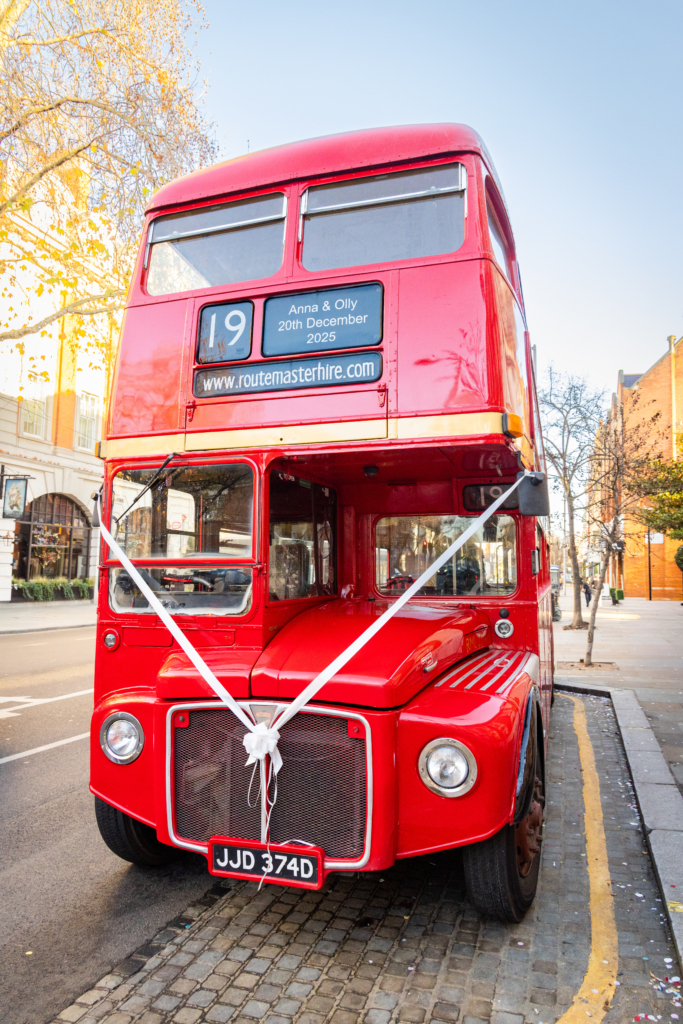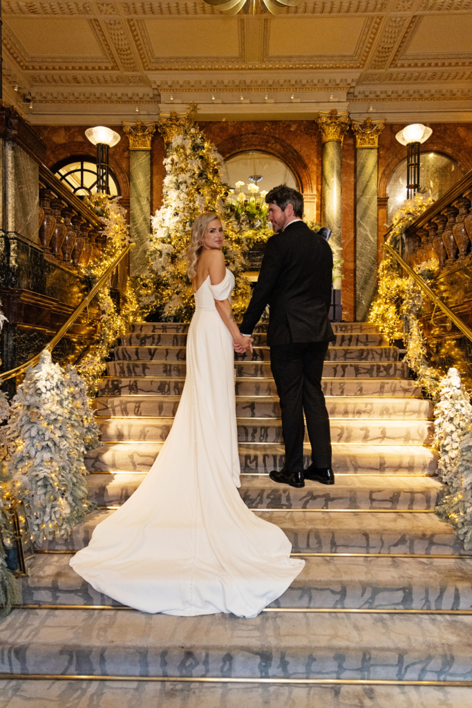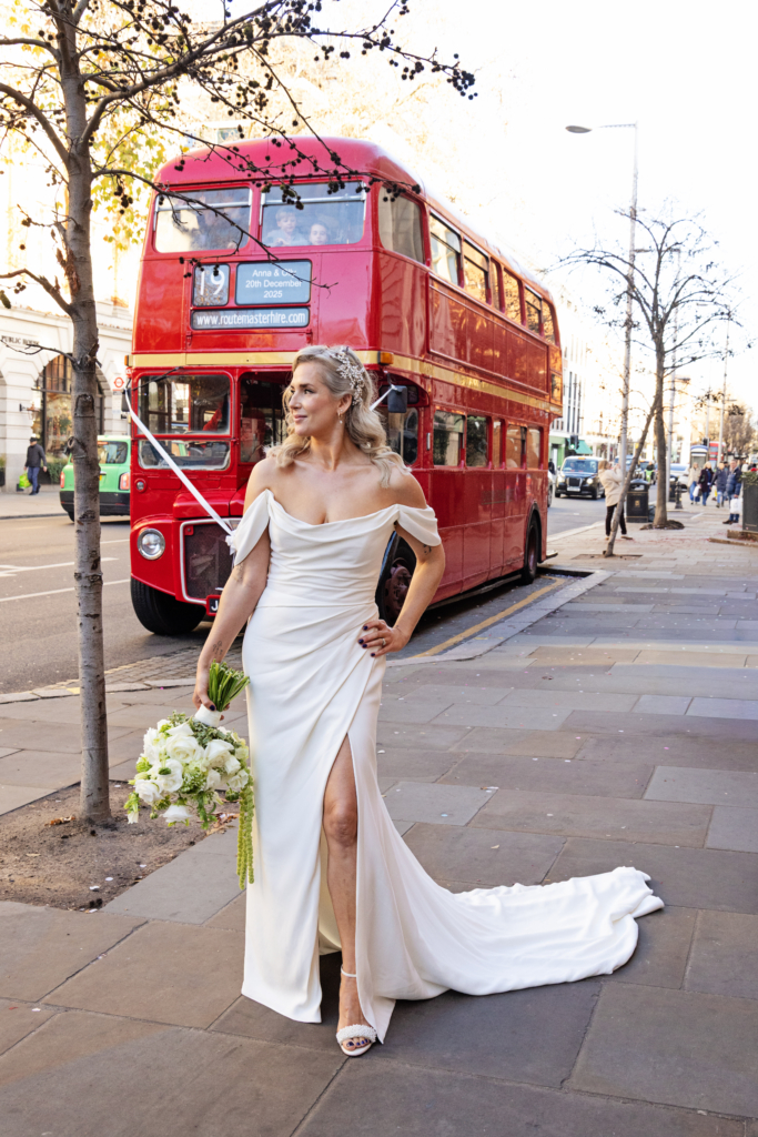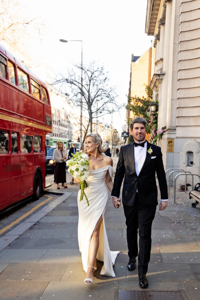 We got married at Chelsea Town Hall with our closest family and friends, which felt intimate and perfectly us. Afterwards, we jumped on a red London bus and headed to the Mandarin Oriental for our reception, which felt incredibly special as it is where we had our first date. We knew how magical the hotel would feel at Christmas, and we were right. We had our wedding breakfast in the Loggia Room overlooking Hyde Park and the sun shone for us, which made the whole day feel even more magical.