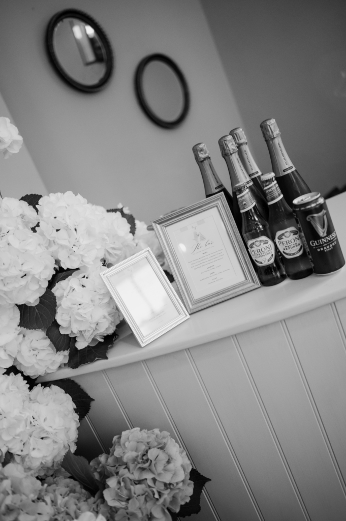 After the ceremony, cocktail hour took place at our hydrangea draped bar with free flowing champagne, wine, beer and three bespoke cocktails. Maple’s Margarita, named after our cockapoo. The Harper Lower Highball. And Liv’s Laugh, Love Paloma.