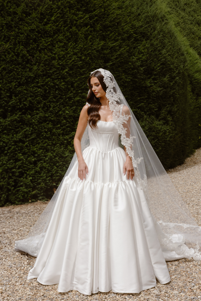 When I began trying on dresses in London, I found most styles fell into two categories. Either very classic or very edgy. Neither quite felt like me. I did some research and discovered Bridal Rouge Gallery on Connaught Street, where House of St Patrick was stocked. I booked an appointment with my bridal party, and the moment I walked into the showroom I saw The Britannia. A mikado silk gown with a tiered skirt that immediately stopped me in my tracks.