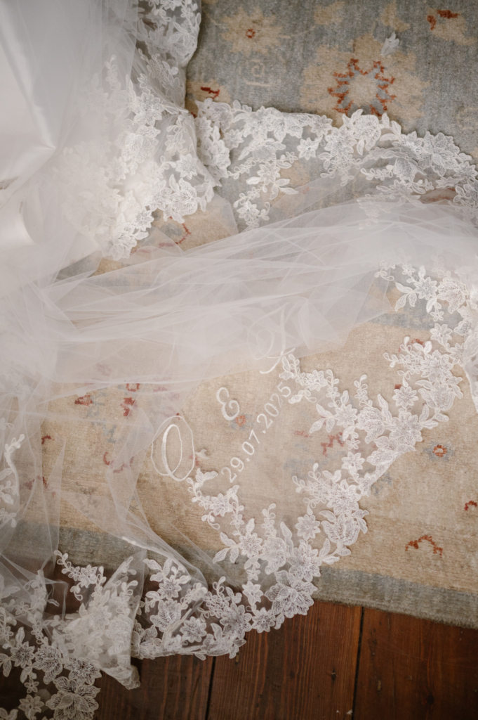 As soon as I tried it on, we all knew. It felt like it had been made for me. I paired it with Amina Muaddi heels, chosen because the lace mirrored my mantilla cathedral veil. I later had our initials and wedding date embroidered into the veil, which made it feel incredibly special.